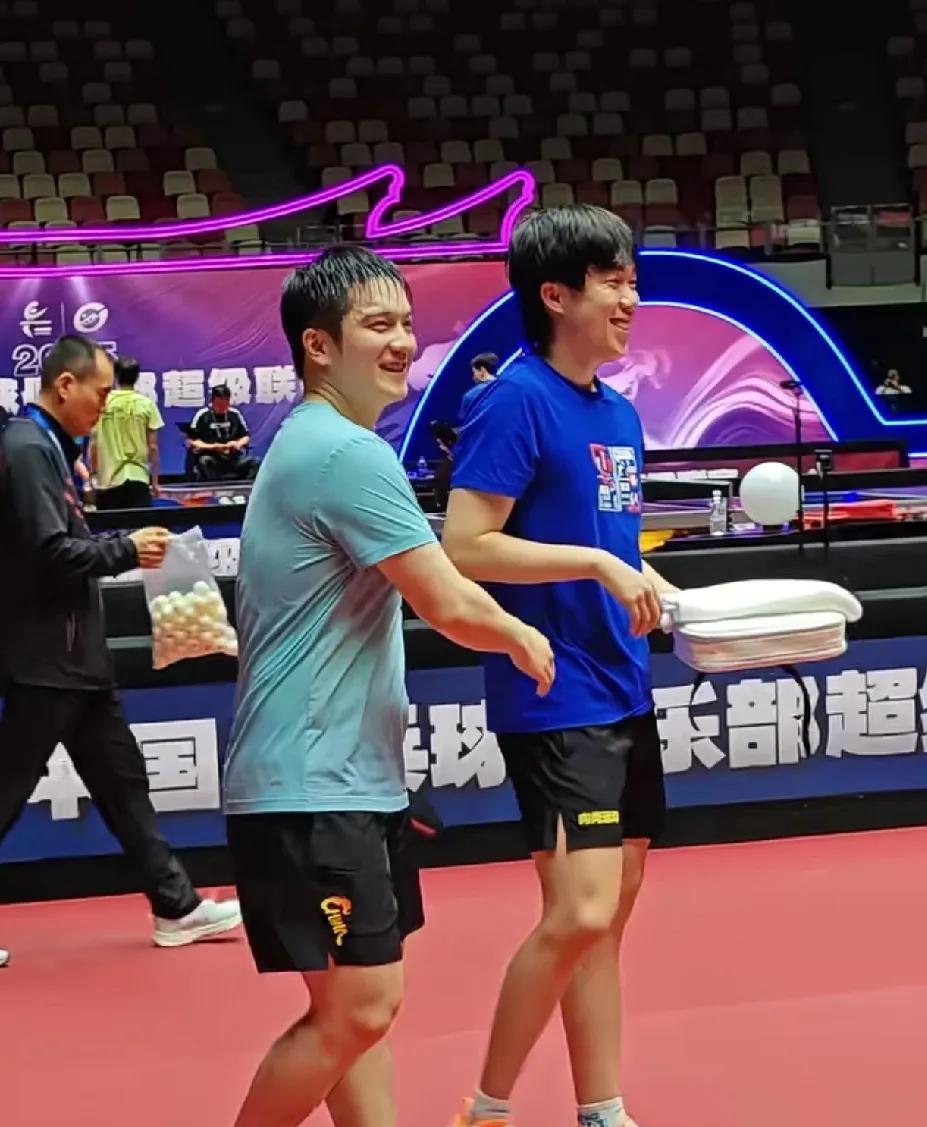 看这兄弟两个笑得多开心 乒超联赛第二阶段即将开启, 各俱乐部的队员在赛场训练。