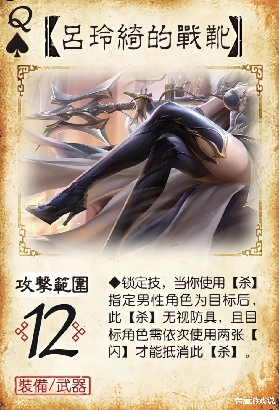 吕布的女儿吕玲绮,我看也是青春可爱呀。吕玲绮的战靴,具备着和吕布同样的【无双】效果,当然这么漂亮的战靴,只对男性角色生效!本来输出能力就高,哪个男性武将能在吕玲绮面前存活下来?