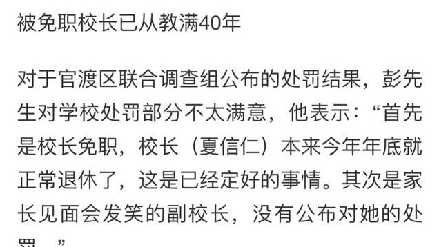 对于学校事件中被免职的校长,一名家长向记者表示,还有不到两个月就要退休了,所以对他的免职根本就谈不到处罚的作用,说不定还是提前退休,少干两个月早领退休金安享晚年。