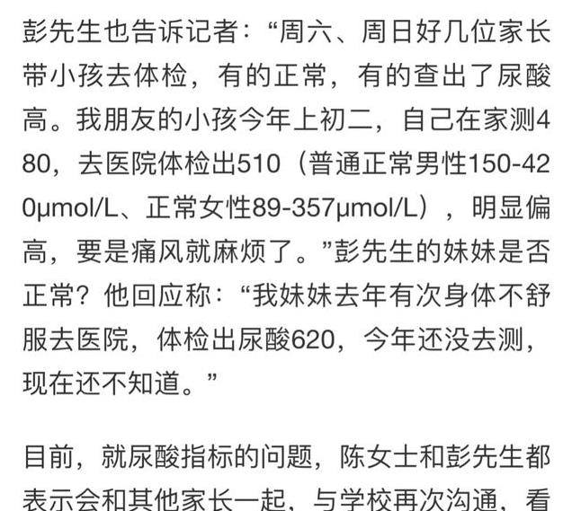 与此同时,家长还向记者表示在发现了臭肉的问题之后,担心孩子身体的家长都将孩子带去医院做了体检,不少人都反映自己家的孩子尿酸偏高