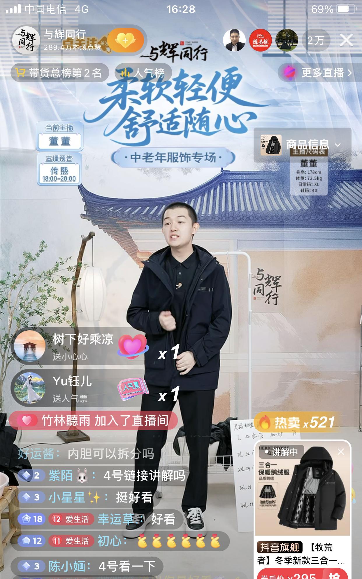 穿啥都帅的董董[憨笑][呲牙][憨笑]! 这两天与辉同行直播间给网友们准备了反季节的羽绒服,没想到在火热的夏天里,买羽绒服的人还这么多[大笑][呲牙]。 董董先试穿了一件黑色的,又试穿了一件红色的,评论区里“帅”声一片,这哪儿是带货羽绒服呀,这简直就是看董董羽绒服走秀了[捂脸][捂脸][捂脸]! 这几天高温,稍微一动就是一身汗,穿着短袖都热得没处去[憨笑]。与辉同行直播间小黄车里准备了反季节必备的过冬羽绒服,纷纷下单,羽绒服销售得也很好[呲牙]。