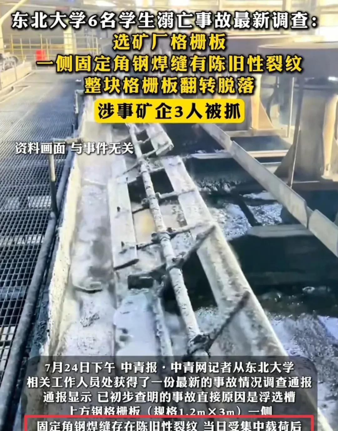 6名学生溺亡,事故原因已查明:格栅板固定角焊缝有陈旧性裂纹,整块板子翻转脱落。这场悲剧原本可完全避免! 格栅板下方就是浮选槽,工人们平时在上方走动,有承载、防护、隔离的作用。一旦这个板子出现问题,轻则工具掉落,重则人员陷入,所以它的质量安全非常重要。 然而在本次事故中,格栅板一侧固定角的钢焊缝处,有陈旧性裂纹。这说明这个地方之前早就出现了问题,但企业负责人视若无睹、不管不顾,丝毫没有考虑到这么做会出现的严重后果。 6名学生上去后,原本就有问题的固定角,不堪其重直接断掉,整个板子踏空翻转,学生来不及反应,想自救或被救都来不及! 实际上,就在几个月前,企业有对格栅板进行过小的更换和维修,但却忽视了这个焊缝问题,再加上没有限载重、限人数的标识提醒,痛心的悲剧就这样突然发生。 不管是面对学生还是工人,但凡将生命安全放在第一位,更换新的固定角和安全提醒只要有一条能做到,这场事故100%可以避免。 6名优秀的大学生即将毕业,为社会做贡献,其中一位来自重庆的同学,是他们村第一个大学生,学习成绩非常优秀,今年刚刚保研。现在只能躺在冰冷的殡仪馆中,等着悲痛的家人从各地赶来,处理后事。 目前,涉事企业的3人已被采取刑事强制措施,有律师分析,家属可起诉企业赔偿医疗费、丧葬费和死亡赔偿金外,还可以以重大伤亡事故来追究主责人员的刑事责任,符合立案标准的话,最高可判7年。 再多金钱上的赔偿和再多人员上的处理,也换不回6条鲜活的人命。安全生产、人命关天!只希望所有企业能够真正落实到,不因疏忽留下任何安全隐患…… 【关注@小讼言案 ,为您分享更多精彩】 (来源:中国青年报)