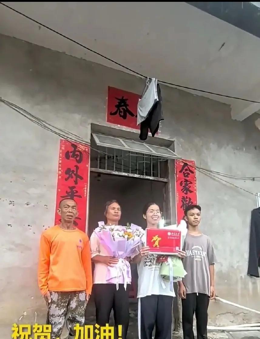 7月21日,广西玉林。一辆邮政车颠簸在乡间泥泞的路上,邮递员要将一个特大喜讯送往博白县凤山镇竹围村的高考状元李秋菊同学,她被北京大学录取了。 李秋菊不仅是全村第一个考上北大的学生,也是全镇第一个考上北大的学生。邮递员很为李秋菊自豪,带上录取通知书,捧上花束,前去道贺。 李秋菊的家境贫寒,父母是普普通通的农民。家里也没有什么像样的家具和电器,唯一亮眼的是土墙上贴满的奖状。 这些奖状记录她一步一个脚印,在学习的道路上奋力拼搏。功夫不负有心人,李秋菊终于实现了她的梦想。 #女孩考取北大 家中土墙贴满奖状##女高考状元# #分享城市新鲜事#