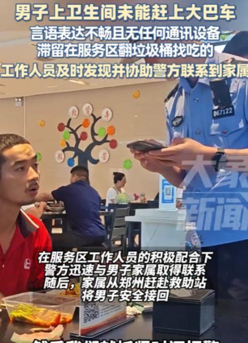 “冤不冤!”7月19日,河南,男子坐大巴车去外地打工,在服务区上厕所时,被粗心的司机遗落在服务区。由于身上只有一张车票和身份证,男子只能在垃圾桶里找东西吃,工作人员发现后及时报了警,家属赶来接走了男子。网友:大巴司机太不负责任了! 7月19日那天,河南一名男子坐上大巴车赶往外地打工,在服务区上厕所时,被粗心的司机遗落在服务区,这一幕,听起来像电影里的情节,可这真真切切发生在了一个普通人的身上。 男子姓张,三十多岁,原本是打算去外地打工,挣点钱养家糊口,那天他和其他乘客一起上了大巴车,车子一路开往目的地,在服务区休息时,张先生下车去上厕所。 他想着就几分钟的事,没想到司机没等他,直接发动车子走了,张先生上完厕所出来,发现大巴车已经开走了,这可把他吓坏了。 张先生身上只有一张车票和身份证,身上没带多少钱,也没带手机,他站在服务区,看着来来往往的车辆,心里又急又怕,服务区人流量大,他不知道该找谁帮忙。 肚子饿了,他只能去垃圾桶里找东西吃,这一幕想想都让人心疼,一个成年人,在异乡被丢下,又饿又怕,只能靠垃圾桶里的东西填饱肚子,这日子怎么过。 服务区的工作人员发现了张先生,觉得他行为异常,就上前询问,张先生把自己被遗落的事情告诉了工作人员,工作人员一听,赶紧报了警,警察赶到后,了解到张先生的身份信息,联系上了他的家属。 家属得知消息后,赶紧开车赶到服务区,把张先生接走了,张先生回到家,抱着家人痛哭,说自己在外面受尽了委屈。 这件事在网上传开后,网友们炸开了锅,大家纷纷指责大巴司机太不负责任了,司机在服务区停车,乘客下车休息,这是很常见的情况,司机应该等所有乘客都上车了再走,可这位司机却把张先生给忘了,张先生被丢在服务区,又饿又怕,这谁受得了。 网友们的评论很犀利,有的说:“司机这是把人当货物,随便丢下,”有的说:“大巴司机太粗心了,这种事怎么还能发生,”还有的说:“希望司机能得到应有的处罚,不能让这种事再发生。” 这件事也让人反思,大巴司机在行车过程中,应该更加细心,不能因为一时的疏忽,让乘客受到伤害,乘客在下车时,司机也应该多留意人数,确保所有乘客上车后再离开。 同时,服务区的工作人员也应该多关注一下像张先生这样的乘客,及时提供帮助,这件事虽然过去了,但它给人们敲响了警钟,大巴司机的工作看似简单,其实责任重大,每一个乘客的安全都掌握在司机手中,司机不能有丝毫马虎,乘客们也应该提高自我保护意识,避免类似的事情发生。 素材来源于大象新闻。