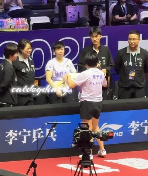 莎指导今天又上线了。 周冠达:看到深圳大学这边的场外分别是孙颖莎指导、张成指导、