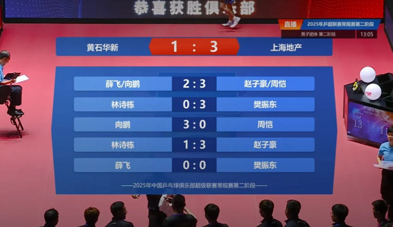 上海地产3比1黄石基地 第一盘男双向鹏/薛飞2比3不敌赵子豪/周凯 第二盘樊振东3比0林诗栋,三局都打到了关键分,樊振东显然心态更稳,整体状态保持的很不错。 第三盘向鹏3比0周凯,为团队拿回一分。 第四盘林诗栋1比3爆冷输给赵子豪,这是所有球迷没想到的结果,近期林诗栋状态欠佳,但赛事紧张,没时间调整,也让不少球迷为他担心。