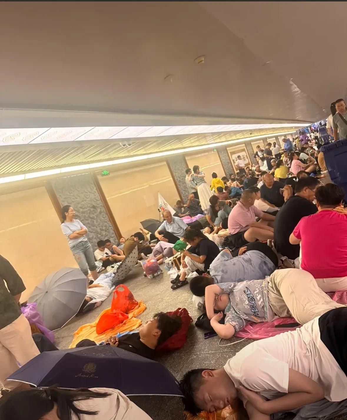 7月24号,北京天安门地下通道。 这是来北京赶在93阅兵之前,来看天安门升国旗仪式的。一家四口正在通道内睡觉。这准是外地来京的旅客。为了给孩子们上一堂爱国主义的课程,为了能赶在早上5点钟的升旗仪式,他们选择了在通道内席地而睡。在地下通道内过夜,没有回宾馆,因为回宾馆怕来不及,明天早上的升旗。还有大批的旅客在通道内睡觉,就是为了能看一眼。明天的升旗仪式。7月24号前下了一场雨,北京的天气是又闷又热。 睡在这通道里,唯一的好处就是没有小偷不用为了自己的安全而费心。看来他们一家今天是玩儿好了,能在这又热又潮的通道里睡觉。暑假的北京是旅游的旺季,大批的旅客来到北京旅游,各个景点都是人满为患。希望他们一家四口能在北京旅途愉快,给孩子们上一段生动的爱国主义课程。