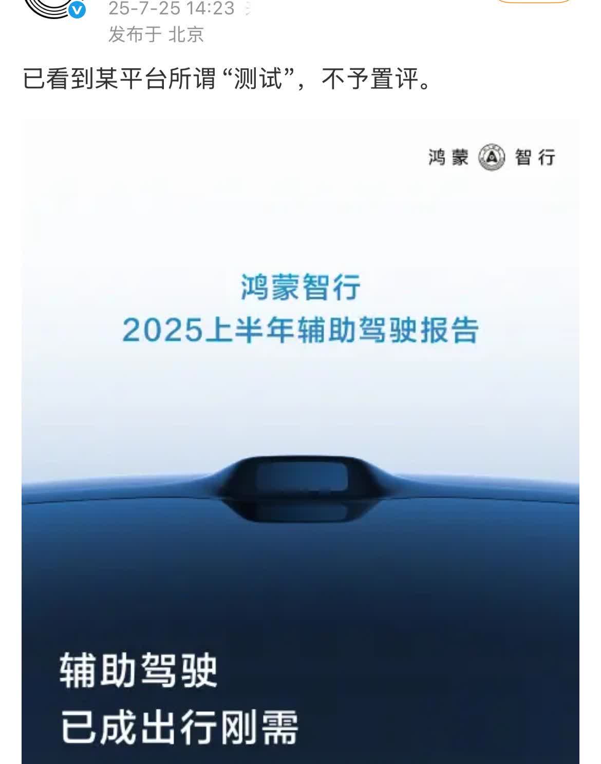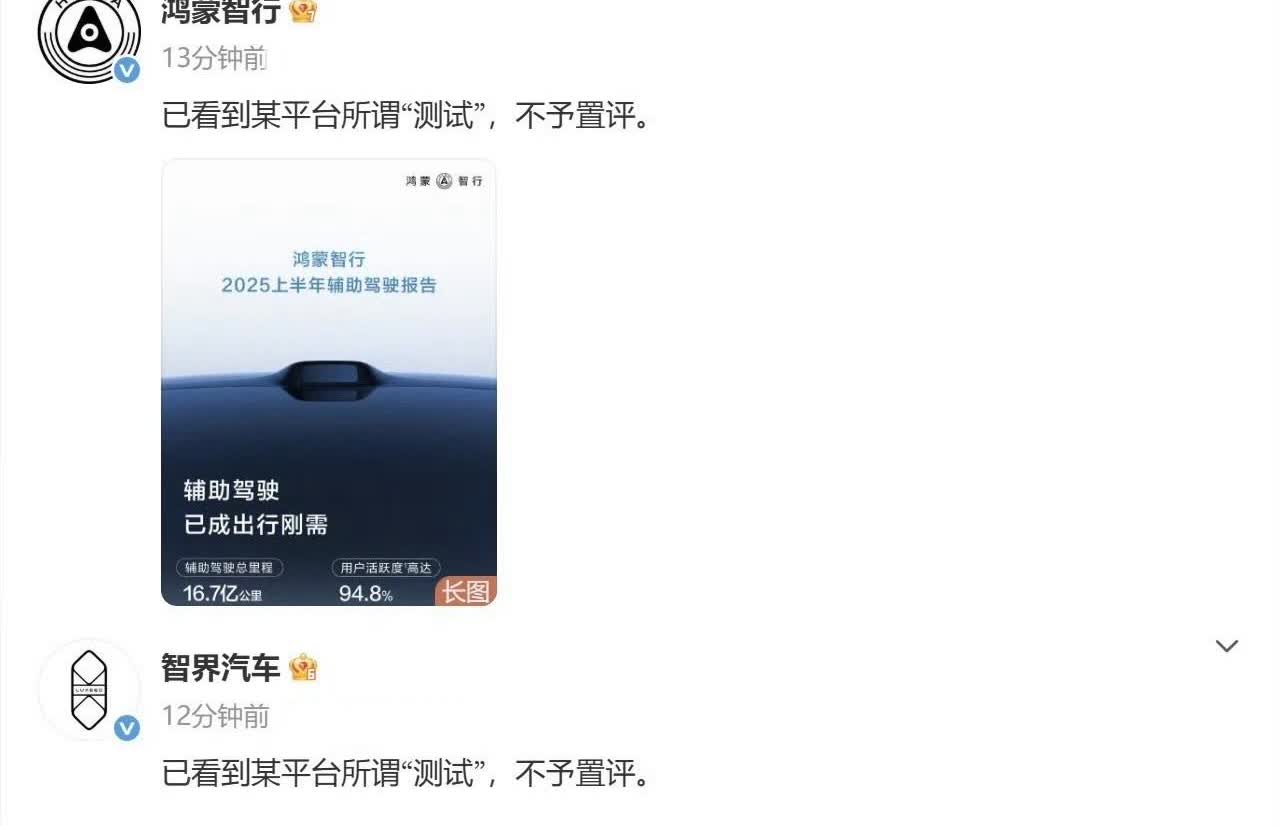 这算是官方回应? 鸿蒙智行、智界汽车和AITO汽车,就在刚刚几乎同一时间发布:已看到某平台所谓“测试”,不予置评。 评论区也是也是一片力挺的声音(图三)。 这就愈发显得有意思了,没想到还能看到几家联合回应,其实上次冬测的时候,关于问界M7的测试当时就闹的沸沸扬扬,余承东还亲自下场在朋友圈吐槽,这次看起来大嘴是忍住了,但回应也是不能少的。 感觉这件事短时间内不好结束,余波还会继续,孰是孰非,是要有个交代……