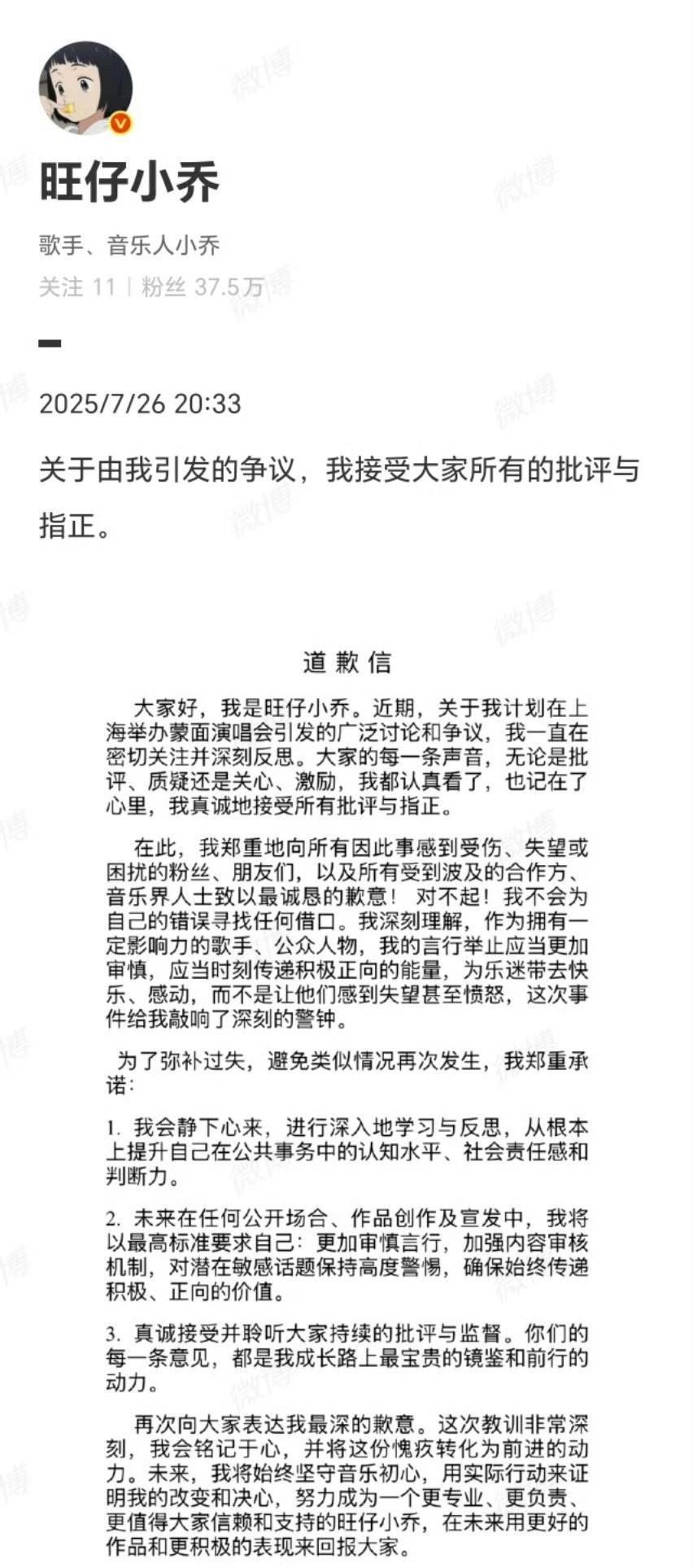 旺仔小乔知道怕了 出来道歉也不是因为她知道自己错了,而且怕保不住自己的饭碗,娱乐是个圈,她一下得罪两大顶尖歌手,现在是汪苏泷和张碧晨还没反应过来,等反应过来的时候旺仔小乔得在夹缝中求生存,所以现在只能出来道歉。 她是道歉了,但是就像一圈打在棉花上不痛不痒,只是表明自己还想吃这口饭,强行道歉。