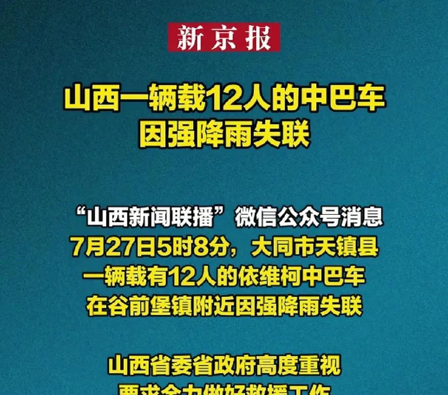 大同12人中巴失联,据当地多名网友透露:车上都是农村妇女,为了挣100块钱,坐车去大棚帮摘辣椒。没想到因为天下暴雨、河流泛滥,发生了如此令人揪心的事情! 事发地是在大同市天镇县的谷前堡镇,从地图看,位于县城附近,北部有火车站和高速,南部是河流与主城区,受交通和市场的影响,大棚种植业较为发达。 中巴车失联的时间是早上5时8分,这么早的时间,她们就已经在路上前去务工,那从家里起床,处理一下杂物,再集合坐车,至少也得花去1个小时,可见是有多么的辛苦。 有网友曝出了具体的工作时间,早上进大棚干到中午11点,下午2点又继续,一天可挣100块钱。现在正是炎热的夏季,大棚内更是十分闷热,气温直逼40多度,这点血汗钱拿到手真的太不容易。 目前官方提到的是失联,并且明确说明是因强降雨,所以有很大的概率是道路桥梁垮塌,中巴车坠入河道被冲走。 能载12人的中巴车,质量不会太轻,不太可能是在路上行驶,直接被水冲走。因为一旦有水漫上来,司机肯定会评估情况,采取自救,或将车辆直接开往他处避险、或直接疏散乘客下车,不会现在连人带车都找不到。 当然,还有一种情况是因强降雨引发滑坡等阻塞交通,中巴车被困荒野,手机信号断绝,这才联系不上,也暂时没被找到。 12个农村务工妇女就是12个家庭,她们是母亲、妻子、女儿、儿媳,若真因洪水天灾发生不测,背后至亲的蚀心之痛,该如何去缓解? 【关注@小讼言案 ,为您分享更多精彩】 (来源:新京报)