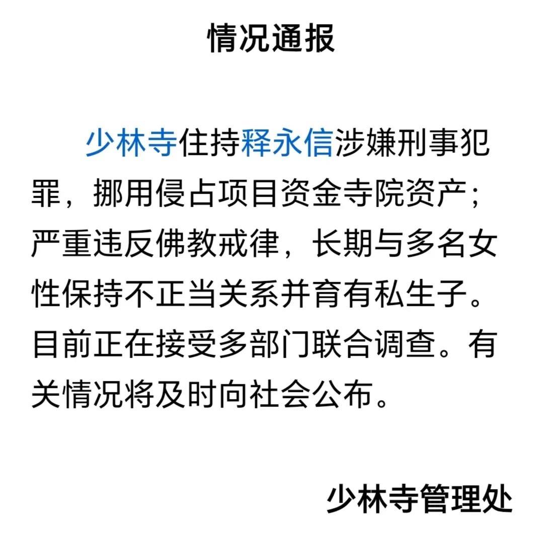 想不到少林寺方丈释永信也暴雷了,这种人居然能在少林寺安然这么多年,一手遮天,太讽刺了! 真是瞬息万变,今天上午还刷到官方辟谣,没想晚上8点却成为事实。不可思议! 这是一个信号,一个标志性事件,反腐反到了佛教界了。另外,淫欲这么深,有私生子,与多位女性保持关系,色戒都守不住。真是佛门不幸! 有网友调侃说,上次少林方丈被查出有私生子问题,还是在北宋年间,私生子叫虚竹,这事闹的挺大,还上了电视。 有网友作诗一首: 搂着姑娘念着经, 不负如来不负卿。 别人笑我太疯癫, 我笑他人看不穿。 身穿袈裟驾巴赫, 不取真经取女经。 菩萨都想学永信, 快快乐乐胜神仙!