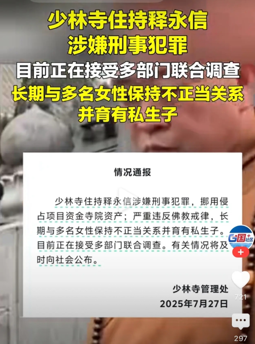 “与多名女子长期保持不正当关系”是私德,也违反相关宗教的戒律,但都上升不到法律层面。所以重点是“涉嫌刑事犯罪”,这就很严重了。 实事求是地讲,释永信是个能人,对少林寺、禅宗文化和品牌的全球推广,有大功劳!一个没什么社会背景,也没什么文化的农村娃,能取得如此大的成绩,实属不易。所以,我不愿对他求全责备。 综合网络信息,释永信与地方既得利益群体的矛盾,在近些年是愈演愈烈的。在很多人眼里,释永信是越来越不“听话”了,随着他的“叛逆”,他的形象在网络上也越来越负面… 而近些年轰然倒下的政界的、商业界、学界的“偶像”不在少数,其实我们应该问一个“为什么”。是人出了问题,还是我们社会出了问题?他们就是坏人,还是他们也是受害者呢?