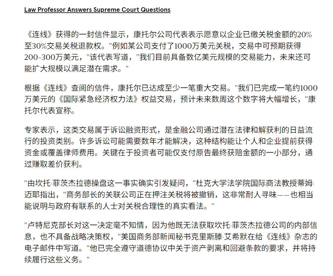 这是美国《连线》杂志的报道,现任美国商务部长霍华德·卢特尼克的家族公司 Cantor Fitzgerald 一直在以极低价格收购美国企业可能获得的关税退税索赔权(他们提议以企业已缴关税的 20%至 30%价格收购退税权)。这意味着:虽然卢特尼克正在鼓吹美国应该到处加关税,但他的家族企业实质上押注特朗普的关税政策将在法庭上被推翻。如果美国法院推翻这些关税政策,相关已经缴纳关税的企业将获得退款——但赔付款会流向当前持有索赔权的人,猜猜谁会大赚一笔?卢特尼克家族。