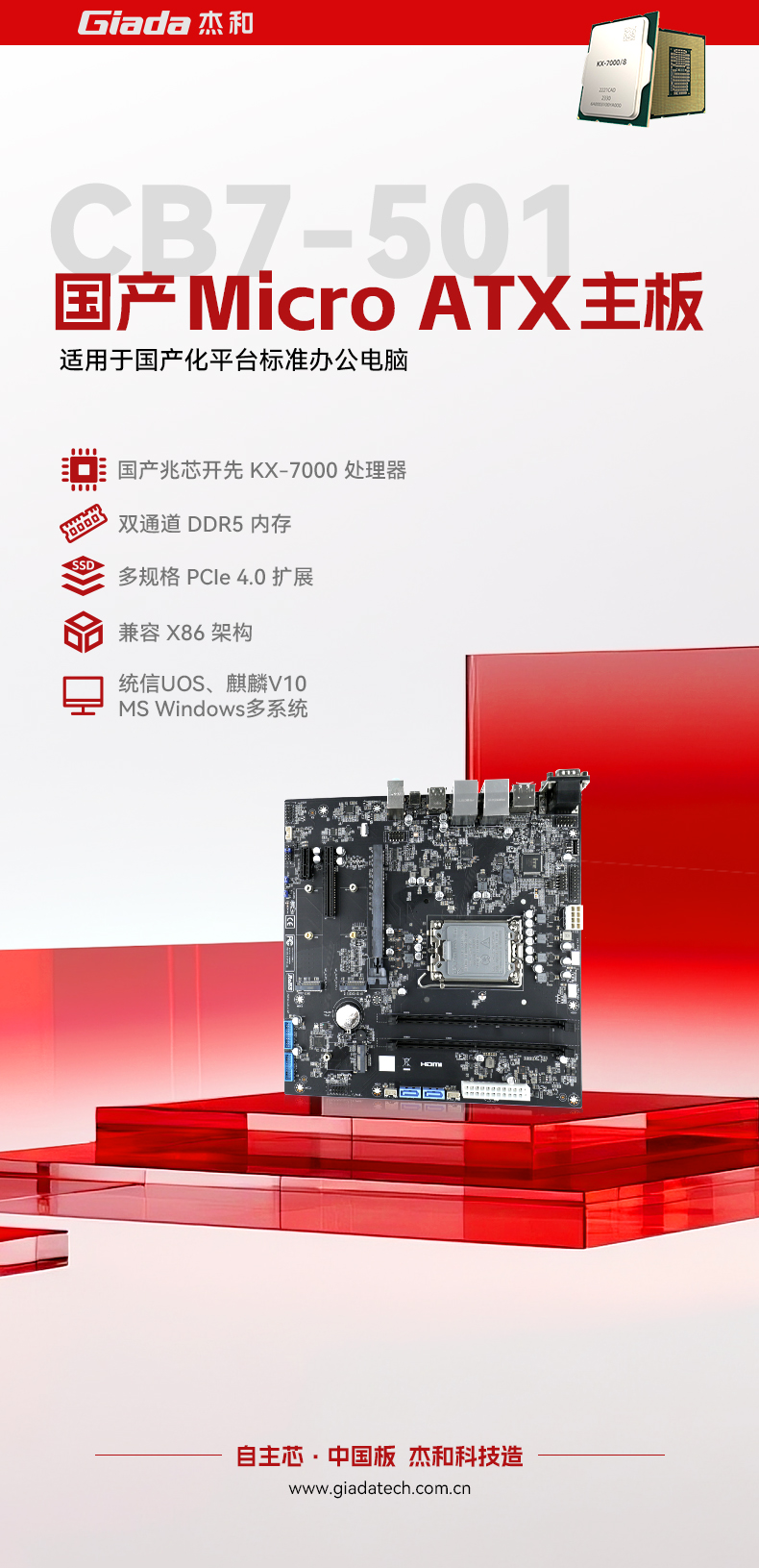 自主芯·中国板|国产化再进一步,杰和科技推出基于国产兆芯开先kx-7000、国产飞腾D3000芯片平台的计算机主板:CB7-501、CB7-306,适用于国产化平台标准办公电脑。