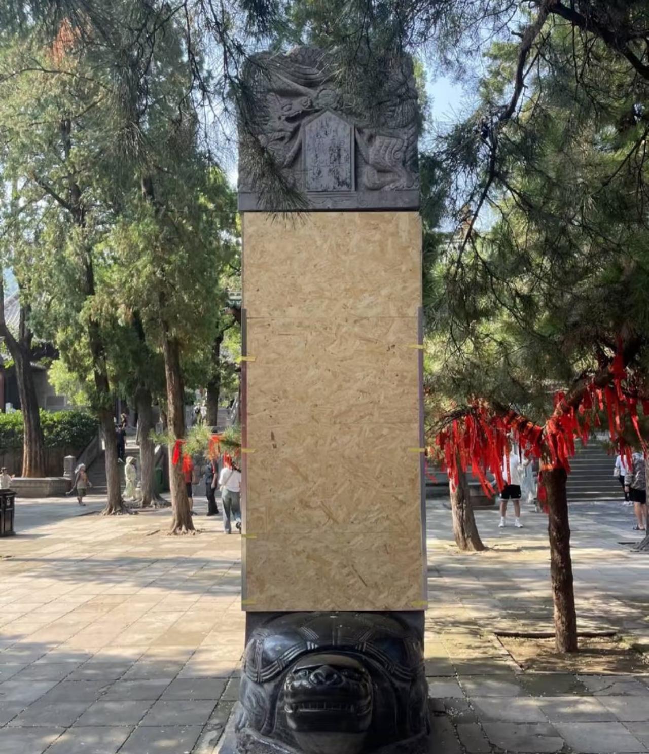 释永信之前在少林寺内还有一块纪念碑,目前调查结果还没出炉,这块石碑已经被遮挡起来