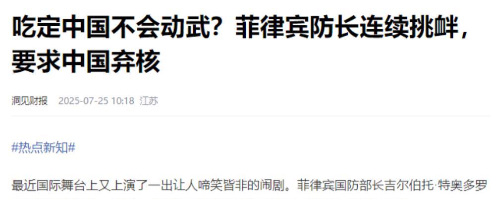 中菲一战,迟打不如早打?菲律宾总统认为,只要中国在南海问题上让步,他们就考虑撤走美国在菲部署的导弹。这纯属痴人说梦,南海诸岛自古是中国领土,法理与实际控制证据确凿,别说美国导弹了,就是美国亲自开着航母过来,也不可能让中国出卖自己的主权问题,在这一点上,想都不要想! 大家怎么看,一起评论区唠唠! 说实在的,他们这种拿主权做交易的想法,显然是严重误判了形势,也可笑的很。 纵观历史,南海诸岛自古就是中国的领土,从汉代的“涨海”记载,到明清水师的定期巡防,再到现代的国际法支持,这片海域的主权归属一直清晰明确。 而且中国在南海的实际控制更是有目共睹,从岛礁建设到海上巡航,每一步都彰显着不可动摇的决心。 可菲律宾近年来的挑衅行为却在不断升级,先是默许美军重返基地,接着在仁爱礁问题上出尔反尔,还配合美军在巴拉望岛搞军演。 更让人费解的是,在东盟其他国家都在寻求与中国务实合作时,菲律宾却逆势而行。 新加坡忙着签自贸协定,马来西亚积极开发南海油气,越南专注扩大对华贸易,唯独菲律宾像个不谙世事的赌徒,把宝都押在了美国身上。 这种选择,让它在东盟内部逐渐陷入孤立。 菲律宾似乎忘记了一个基本事实:它的经济命脉很大程度上系于中国。 从农产品出口到基建项目,从旅游收入到投资合作,处处都离不开中国市场,如果执意与中国对抗,首先遭殃的必然是菲律宾自己的经济发展。 更重要的是,美国在菲律宾部署导弹,摆明了是要把这个东南亚国家推向火线,但问题在于,美国真的会为了菲律宾与中国硬碰硬吗?历史早已证明,依附外部势力从来不是明智之举。 而美国军事介入的程度越深,南海局势就越复杂,“堤丰”导弹系统刚部署,新的雷达站计划又在酝酿,如果任由美军在菲律宾扎根,未来清除这些军事存在的代价只会更大。 如今的中国军事实力已今非昔比,山东舰航母编队常态化巡航南海,东风导弹系统可有效威慑任何挑衅者,海警船队的规模和装备更是远超周边国家。 这些都不是虚张声势,而是实打实的战略资本。 在这种形势下,“早打”的战略意义愈发凸显,继续拖延只会让美军介入更深,让菲律宾的幻想更大。 与其等局势进一步恶化,不如早日划出底线,用行动让对手清醒认识现实。 从经济角度看,菲律宾也更经不起这场较量,其农产品出口、旅游收入、基建项目都高度依赖中国市场。 一旦爆发冲突,菲律宾经济增长至少会下滑两个百分点,这对其脆弱的经济体系将是沉重打击。 而国际环境也在悄然变化,大多数东盟国家都在设法与中国深化合作,没人愿意跟着菲律宾对抗中国,美国虽然口头支持菲律宾,但在涉及核心利益时必然会精打细算。 当前的关键是把握好时机,在美军完全站稳脚跟之前,在菲律宾战略误判进一步加深之前,果断出手或许能以最小代价解决问题,这不是好战,而是为了避免更大的战争风险。 南海主权问题从来就不是讨价还价的筹码,菲律宾如果真以为几枚美国导弹就能要挟中国让步,那未免太低估了中国捍卫领土完整的决心! 对此,大家有什么想说的呢?欢迎在评论区踊跃留言!麻烦看官老爷们阅读后点赞关注,谢谢!