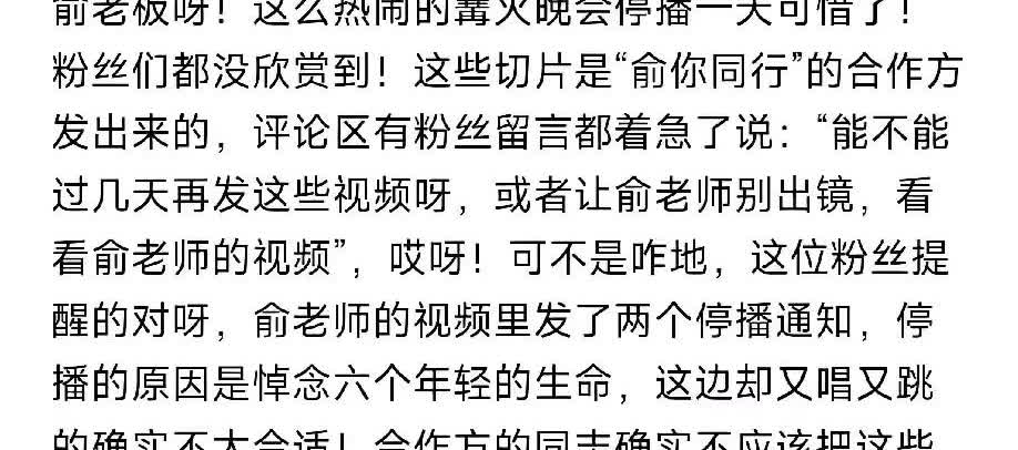 俞老师啊,您这是在干嘛呀?怎么总是把握不住焦点呢? 榕江受灾,董宇辉什么都没说就把捐款物资拉去了,结果俞老师非要弄个卖产品才捐款,结果让网友一顿批评,最后捐款物资也没有少,还要出来道歉,图什么呢? 现在又弄了个悼念六位学生,俞你同行和看世界停播一天,停播一天以后,俞你同行正式开始,篝火晚会上又唱又跳,连俞粉都觉得不合适啊! 俞老师真的老了,考虑问题真不周到,如果旁边的人能够参考一下,也不至于这样啊!