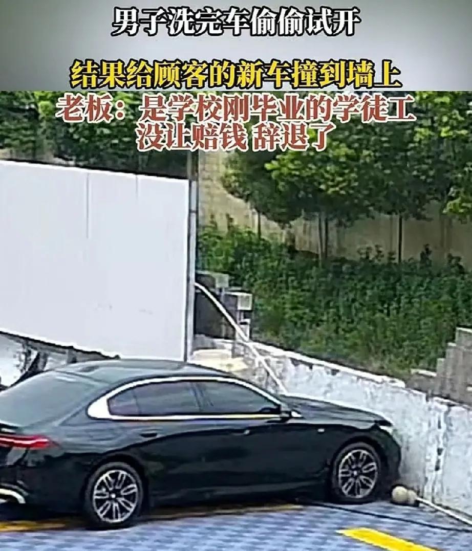 7月27日,上海。客户将一辆宝马车,交由一家洗车店洗。一个刚从学校毕业的学徒工接下了这趟活。洗完车后,小伙子很想试开一下这辆车。但是公司有规定,没有驾照是不能开车的。小伙子没有驾照,见周边没人,决定偷偷的开一下子。 他先是往后倒车,然后准备调头。但他技术不行,车撞到了前面的墙上,将墙面撞塌了一大块。还好小伙子及时刹住了车,没闯下更大的祸。 老板考虑到小伙子刚毕业,没有赔偿能力。但小伙子刚来上班,就目无公司的规章制度,是不能容忍的。最后决定,给予小伙子辞退处理,没让他赔偿。 国有国法,家有家规。公司的规章制度,就是为了保证公司能够正常的运转。小伙子想开车,本意是想学到更多的东西,可以鼓励。但驾驶汽车具有危险性,必须在师傅的指导下进行,以防不测。小伙子擅自驾车,多危险啊。希望小伙子接受教训,不要乱来。 #如何评价洗车小伙偷开客户宝马撞墙# #小伙偷开客户宝马无证驾驶撞上墙##分享城市新鲜事#