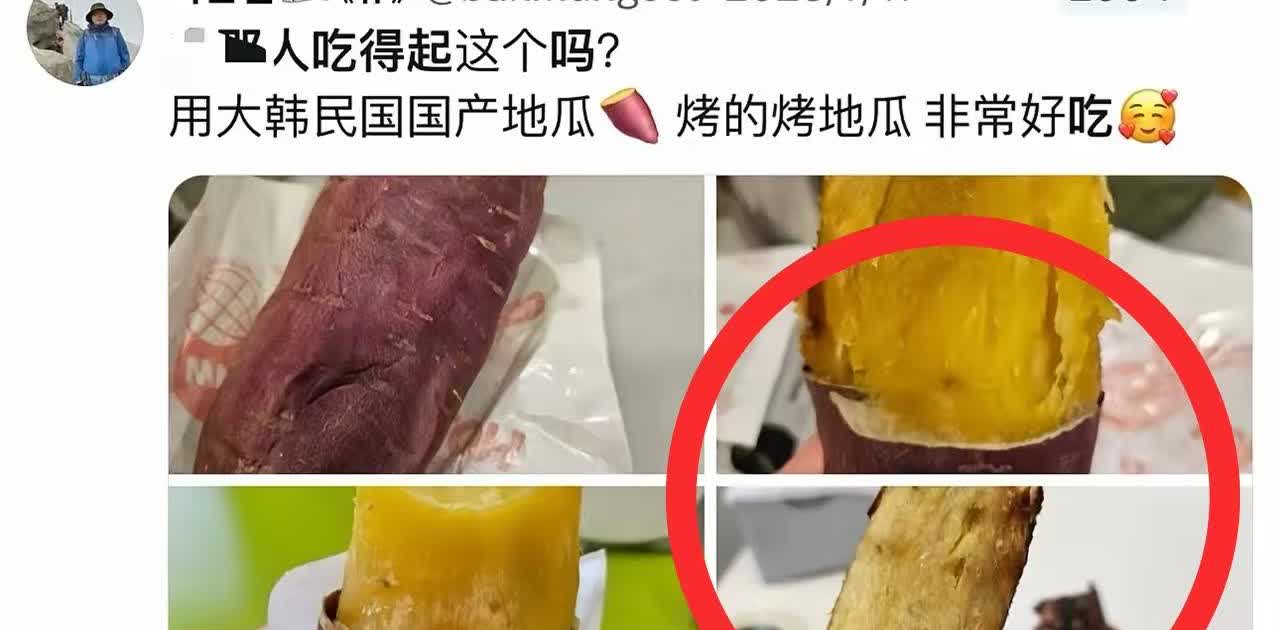有一个韩国人天天在外网发帖内涵中国,搞了个韩国美食系列,主题是:“中国人,你们吃得起这个吗”? 在中国人吃西瓜只吃瓤而韩国人还吃瓜皮的年代,还以为韩国有什么王炸美食要来挑战中国,直到我打开一下,瞬间傻眼了! 这个韩国博主在问我们:你们吃得起烤红薯、方便面、酸奶、汉堡、炸酱面吗? 就连我们在老家的奶奶,从我记事起她就不乐意吃红薯,她说吃了一辈子红薯,现在是吃不起肉还是咋滴,还让我吃红薯。如果你现在问她红薯是拿来干嘛的,她肯定会回答是你拿来喂猪的。 以前就有人天天在网上抹黑我们吃不起茶叶蛋,现在轮到红薯了吗?