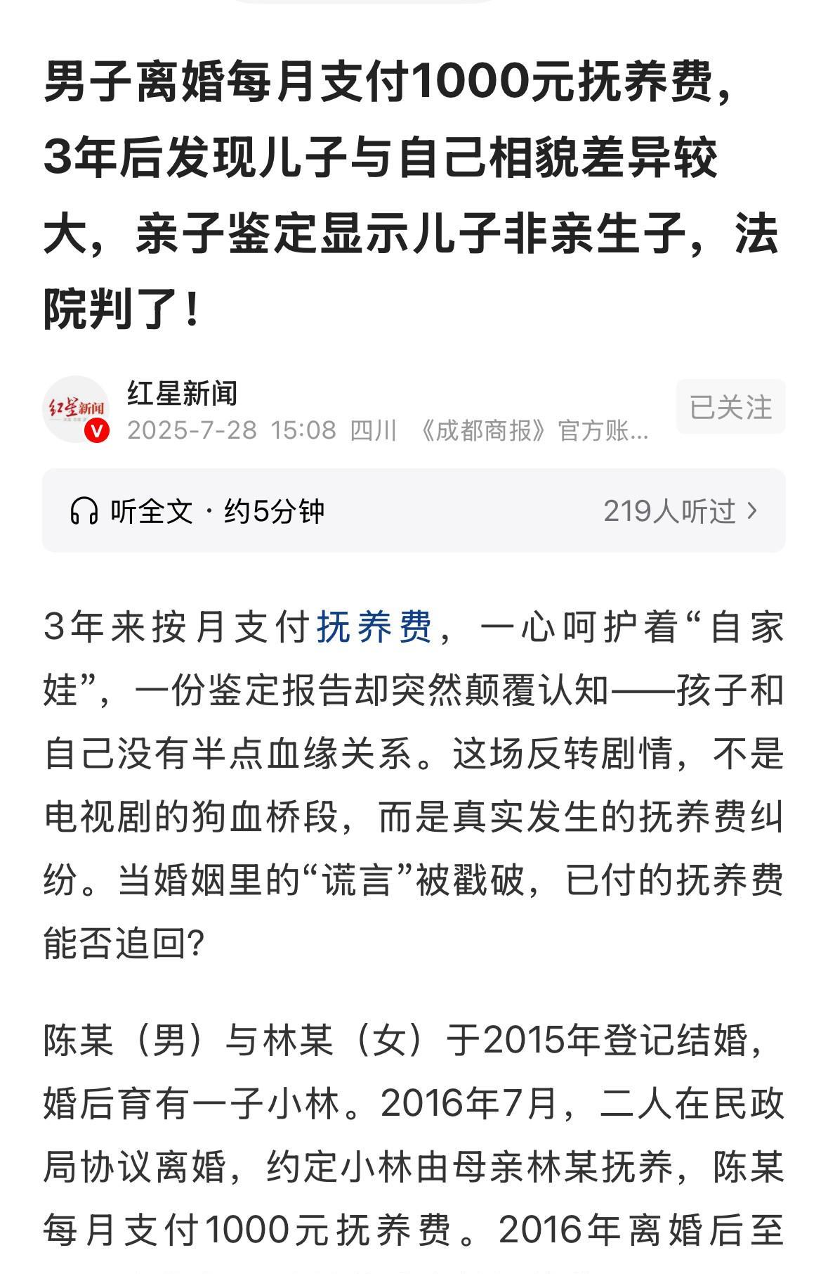男子结婚仅一年就离婚,离婚后孩子归女方抚养,男子每月按时支付1000元抚养费。3年后男子越发觉得孩子跟自己相貌差异太大,提出亲子鉴定被拒绝,于是停止支付抚养费。5年后男子索要抚养费,再次要求亲子鉴定,女方同意了!鉴定结果孩子的确不是男子的,男子起诉返还3.2万抚养费,并赔偿精神损害抚慰金2万元。女方声称已过3年起诉期,拒绝返还,法院判决很意外! 据红星新闻 7月28日报道,陈某跟林某离婚9年后,却因为抚养费问题闹到法院。 陈某跟林某是在2015年登记结婚的,当时的林某好像很着急要结婚的样子,陈某只当是林某恨嫁,就怕嫁不出去的慌张。 婚后不久林某生下儿子,但儿子的降临并没有拴住陈某和林某的感情,反而让二人的感情走到了谷底,于是两个人在2016年7月协议离婚。 离婚后林某将儿子取名叫小林,小林跟着林某抚养,陈某需要每个月支付1000元抚养费。 虽然夫妻感情不在了,但是陈某对儿子的那份父子亲情却不能因为离婚而消散。每个月给抚养费的时候,陈某都会去看看自己的儿子,陪儿子玩一玩。 但是随着小林越长越大,陈某越来越觉得小林跟自己的长相差异太大,怀疑孩子不是自己的,毕竟林某当年并非足月生产。 在2019年陈某提出要进行亲子鉴定的时候,林某却没有同意,陈某只能作罢。但心中已经产生了怀疑,陈某不想给别人养孩子,就断了给小林的抚养费。 直到2024年10月,陈某断了5年的抚养费,但是林某却从未跟陈某索要过抚养费,让陈某更加坚定了自己之前的猜想,于是向林某索要支付3年的抚养费。 这次陈某依旧提出要进行亲子鉴定的要求,没想到林某居然答应了。在陈某将亲子鉴定委托给鉴定机构后,心里一直都很忐忑,久久无法平静。 直到鉴定结果出炉后,陈某的心也终于死了。鉴定结果显示,排除陈某是小林的亲生父亲。 陈某一气之下将林某告上法院,一是要求林某返还3年的抚养费32000元,二是要求林某赔偿20000元精神损害抚慰金。 陈某详详细细回想了一下跟林某从相识到结婚的点点滴滴,发现林某的确很着急结婚,对于女孩子来说,的确是有些反常。 而且离婚后就把儿子改成跟林某一个姓氏,也不符合常理,所以综合这些信息可以推断出,小林很可能不是陈某的儿子。 陈某在支付了3年的抚养费32000元后,发现小林跟自己长相差异很大的时候,就提出亲子鉴定的想法,林某断然的拒绝更加让陈某坚定的认为小林并非亲生。 好在陈某有先见之明断了抚养费的支付,要不然还不知道要给别人养多少年的儿子还不自知。 根据《民法典》第1067条的规定:父母不履行抚养义务的,未成年子女或者不能独立生活的成年子女,有要求父母给付抚养费的权利。 既然如今已经知道小林并非亲生,那么陈某对于小林就不存在抚养的义务,所以陈某支付给林某的32000元抚养费就应该返还回来。 而且林某欺骗陈某那么久,甚至在陈某第一次提出亲子鉴定的时候还在欺骗,对陈某的打击真的很大。 根据《民法典》第1183条的规定:侵害自然人人身权益造成严重精神损害的,被侵权人有权请求精神损害赔偿。 因故意或者重大过失侵害自然人具有人身意义的特定物造成严重精神损害的,被侵权人有权请求精神损害赔偿。 陈某认为林某从结婚开始就在欺骗自己,对自己造成严重精神损害,所以起诉要求林某赔偿20000元精神损害抚慰金。 林某却拒绝返还抚养费,并不认为自己对陈某造成过伤害,声称陈某是知道孩子并非亲生的,而且自从知道不是亲生的开始都已经过了3年诉讼期,不应该被支持。 法院审理后认为,陈某把小林当做亲生儿子支付3年的抚养费,在得知小林并非亲生的情况下要求返还抚养费,法院是予以支持的。 至于林某声称已经过了3年的诉讼时效问题,法院认为林某计算错了认定的时间。 根据《民法典》第188条的规定:向人民法院请求保护民事权利的诉讼时效期间为三年。法律另有规定的,依照其规定。 诉讼时效期间自权利人知道或者应当知道权利受到损害以及义务人之日起计算。法律另有规定的,依照其规定。 陈某知晓小林并非亲生是在2024年做完亲子鉴定后,并非2019年开始停止支付抚养费。所以陈某的诉讼时效应当从鉴定结果出来后开始计算,并未超过3年诉讼时效。 林某声称小林是在婚前怀上的,并没有违反夫妻忠诚义务,所以不存在精神损害,不应支付精神损害赔偿金。 但是法院认为,陈某在不知情的情况下抚养3年小林,侵犯了陈某的人格权,林某应该给与赔偿。 最终法院判决,林某返还32000元抚养费给陈某,并支付10000元精神损害抚慰金。 对于陈某的遭遇,您又是怎样看待的呢?