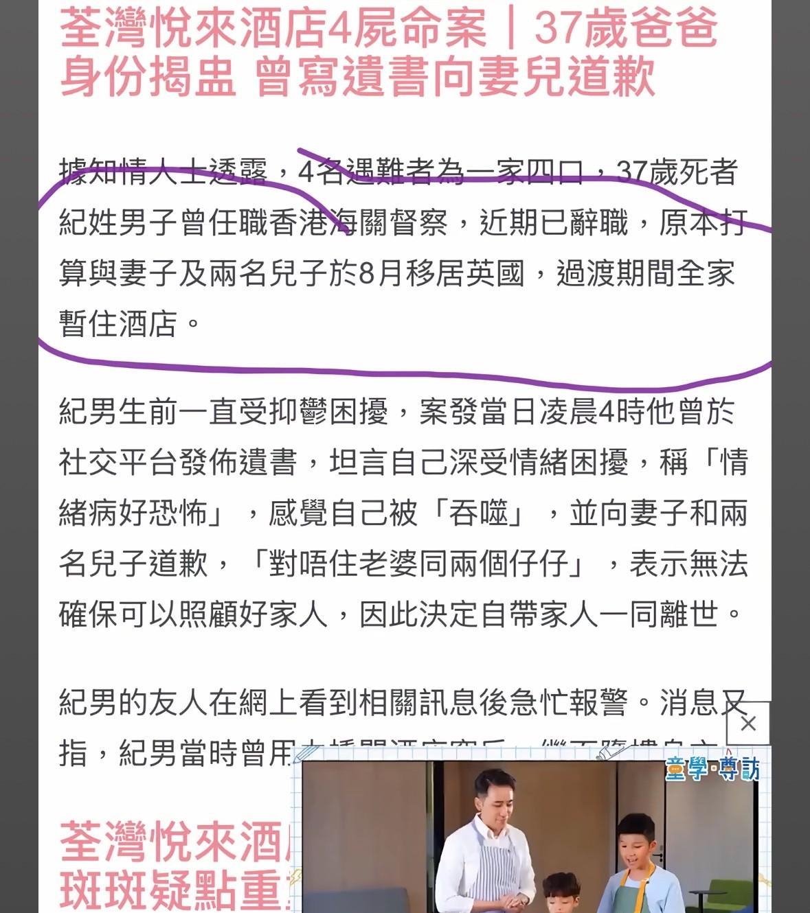 香港一家四口殒命酒店背后的那个孩子妈妈真的好励志啊![流泪]她不仅全职带着两个孩子,还兼职做一份补习的工作,除此之外,还在油管开了账号讲儿童故事! 她与丈夫是中学同学,两个人从校服开始结缘,最终成功走进婚姻。 她长得知性大方,丈夫帅气温和,从外表来看,两个人也是十分的般配。婚后,夫妻俩一同努力为生活奋斗,并先后生下了两个儿子。 她有一个社交账号,里面晒满了一家人的幸福合影!其中,有很多张都是她和丈夫的。两个人一路走来,感情已有很多年,她格外珍惜这份感情,所以才用心的保留了一幕幕幸福的瞬间! 她的丈夫工作体面,稳定,纵使家里收入尚可,连存款都有好几百万。可孩子妈妈也一直没有放弃提升自己的机会,在努力为家庭创收。 两个孩子,一个6岁,一个3岁,仅仅带孩子一事,都够辛苦了。可她既做全职妈妈,又兼职了其他工作,还做自媒体…… 就这么一个努力向上的人,没想到,最终却连一句话都没有机会留下,连带着两个孩子一起离开了。 当脖子被划破的那一刻,真的不敢想象,他们该有多么害怕和无助啊?[祈祷][祈祷]