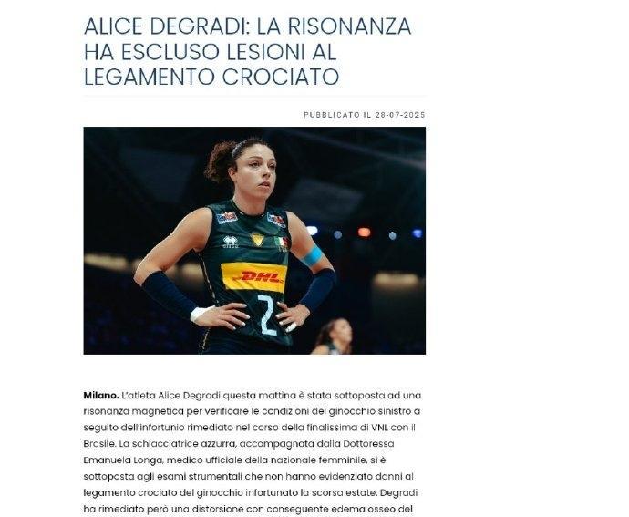 今天上午,运动员爱丽丝.德格拉迪接受了核磁共振扫描,以评估她在世界女排联赛VNL决赛对阵巴西????女排时左膝受伤的状况。 这位意大利????主攻在女排国家队官方队医埃马努埃拉.隆加医生的陪同下接受了检查,结果显示她去年夏天受伤的膝盖十字韧带没有损伤。然而,德格拉迪扭伤导致胫骨外侧平台骨水肿和内侧半月板垂直撕裂,她的康复时间将在未来几周内评估。 祝她早日康复![玫瑰][玫瑰][玫瑰]