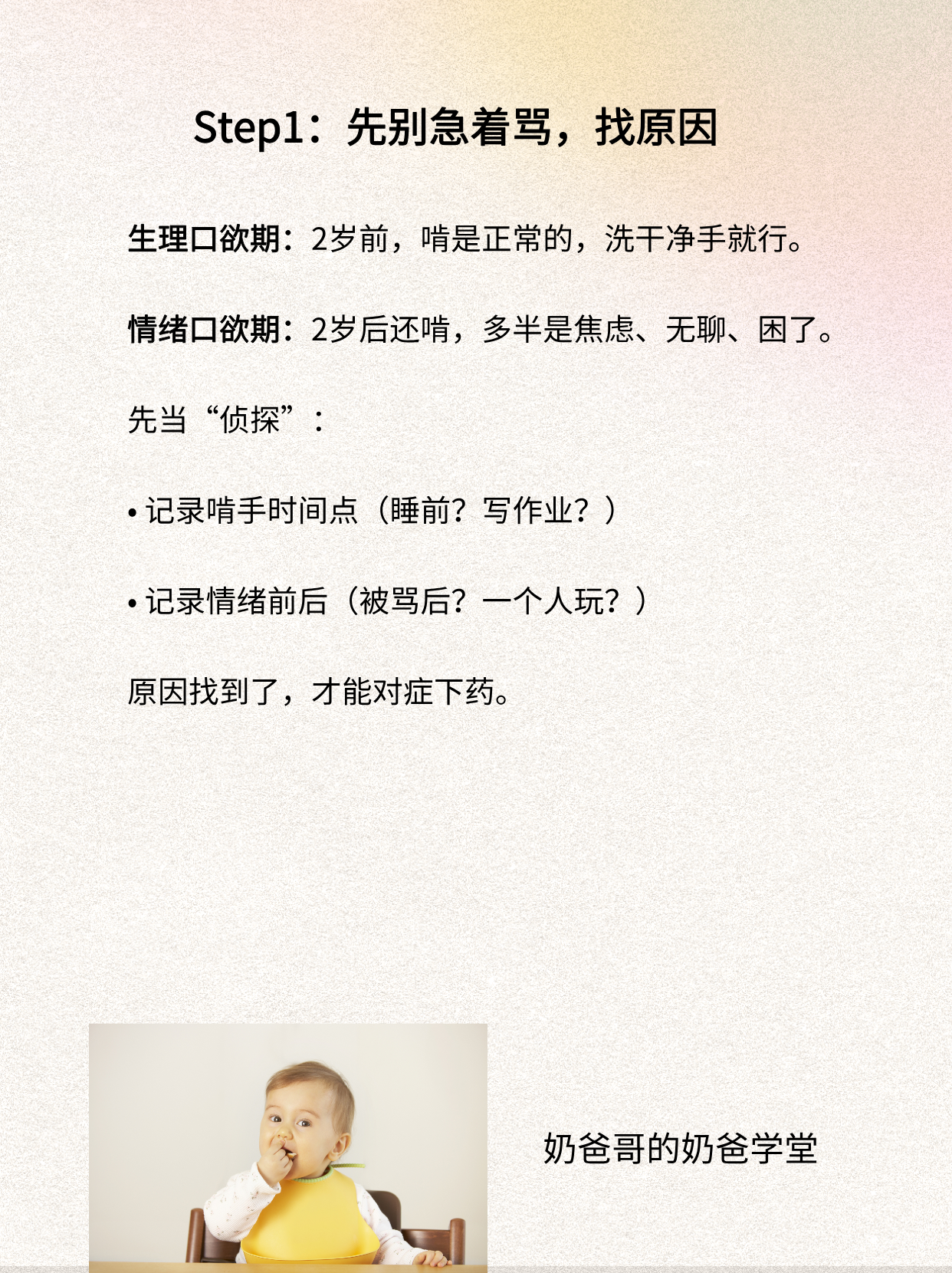 #奶爸育儿经# 吃手,几乎是每个娃都会经历的“小癖好”。3个月大时,那是自我安抚;3岁时,就可能变成“社死现场”。甚至有些孩子吃手到初中,高中,甚至成人了也还在吃手,今天,我就用3步法+4个小工具,手把手教你把孩子从“啃啃啃”里拉回来。
