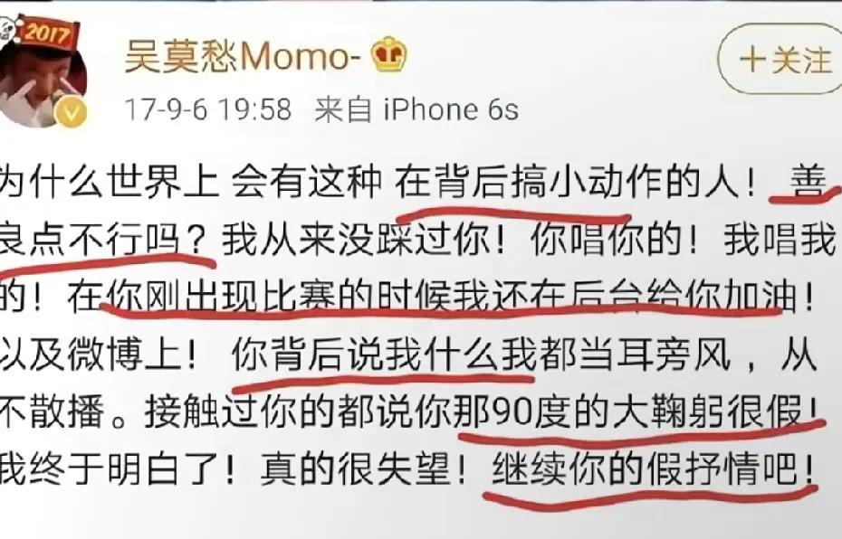 原来吴莫愁和张碧晨也有纠葛。 但转折来得猝不及防。《明日之子》原定嘉宾是她,播出时却换成了张碧晨,气的吴莫愁直接发文内涵,字里行间的矛头,明眼人都看得出指向的是那位在《好声音》舞台上总以90度鞠躬示人的同行张碧晨。 从那之后,吴莫愁的资源肉眼可见地滑坡,甚至一度沦落到去小县城跑商演,让人唏嘘。其实现在回头看,她当年那支画风超前的百事广告,至今仍被不少人念叨——夸张的造型、大胆的表现力,确实惊艳了好几个夏天,那种灵气和辨识度,在华语乐坛里太少见了。 娱乐圈的起落本就无常,但有实力的人终究不会被完全埋没,希望吴莫愁能走得更稳更远。
