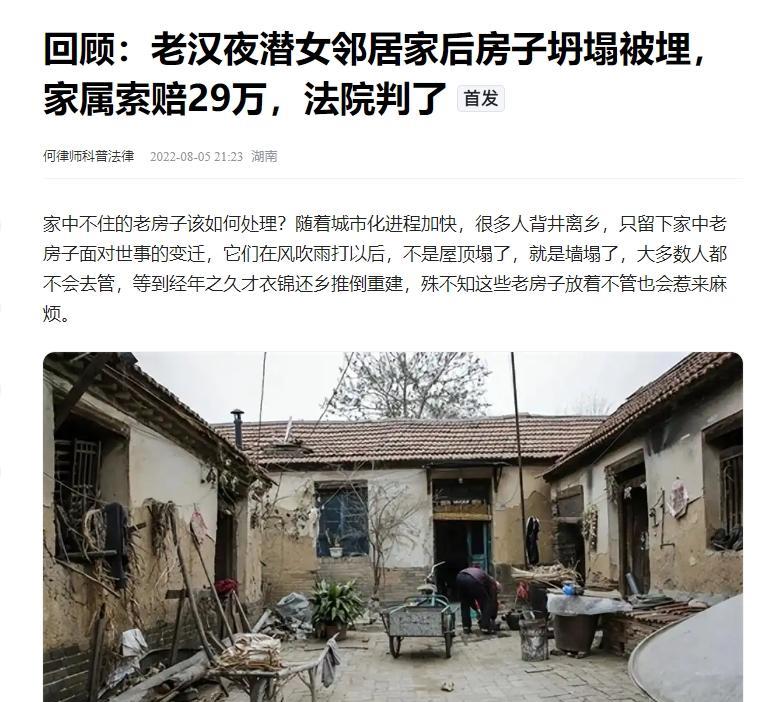 黑龙江鸡西,一七旬大爷夜里偷进入邻居废弃房屋。不料房屋竟然坍塌,大爷被砸中。他儿子伤心欲绝,要求女邻居赔偿290000元。邻居却说,大爷深夜偷入她家,是想偷东西。大爷儿子怒把邻居告到法院。一审判邻居承担20%的责任,共计5万多。双方都不服,同时上诉。最终二审法院这样判了! 深夜乡村总有意外,一位七旬老人偷偷溜进邻居废弃老屋,谁知墙体突然塌了砸中他,命都没了。儿子要女邻居赔29万,她说老人是来偷东西的,这事闹到法院,一审赔5万多,二审怎么判?悬念重重,下面细说这个真实案例。 这个案子发生在黑龙江鸡西一个普通村子,牵扯到几个关键人物。先说陈玉梅,她五十多岁,早年就在村里过日子,干农活养家。后来儿子在城里混得不错,她就跟着过去住了。城里生活不一样,她每天早起去公园练太极,学着城里人养生。村里的老宅子就空着了,还有一处废弃的房子也没管,年头长了墙体都残缺不全。她知道房子老旧,但人不在村里,就没想着修或拆。 罗大虎是七十三岁老头,村里独居,身体还行,但邻居们都知道他有小毛病,喜欢顺手拿点别人东西,从不承认。罗小虎是他儿子,四十多岁,靠务农过日子,对老爸的事知道但没多管。村里人相处多年,这些事大家心知肚明,但没闹大。陈玉梅搬走后,房子无人看管,罗大虎继续在村里转悠,罗小虎偶尔帮老爸点忙。这些人背景简单,农村常见那种邻里关系,不远不近。 案子核心是罗大虎那天晚上出去,十八点左右进了陈玉梅废弃房子,靠着西墙歇着,结果墙塌了把他埋了。房子多年没修,屋顶和墙都缺损,只剩北西两侧部分墙。罗大虎进去后墙倒,他被压住,左股骨骨折,还多脏器衰竭、挤压综合征、创伤性休克。罗小虎次日凌晨五点找人,发现老爸在院里瓦砾下,赶紧送医院,花了一万多医疗费,但三天后人没了。 罗小虎觉得陈玉梅该负责,房子是她的,没设警示也没拆隐患,就上门要赔医疗费、丧葬费、死亡赔偿金,总29万。陈玉梅不认,房子空多年,罗大虎半夜进去目的不明,村人说罗大虎有偷摸习惯,可能想拿废弃钢管啥的。她拒赔,罗小虎就告法院。法院审了,罗小虎说陈玉梅管理不当,房子破成那样没提醒义务,导致事故。陈玉梅说罗大虎成年人,明知危险还进,损害自己造成,不该她全责。 法院根据民法典判的,先看第1252条,建筑物倒塌致损,所有人承担侵权责任。陈玉梅作为主人,知道房子危险,没设告示牌或拆墙,有管理过错。第1179条说侵害人身损害赔医疗费、丧葬费、死亡金。但第1173条,被侵权人有过错可减轻侵权人责任。罗大虎完全民事行为能力人,知道邻居房子老旧,还半夜进,靠墙导致塌,对损害有主要过错。村民证言说他有坏习惯,举证原则谁主张谁举证,罗大虎行为不当占八成责,陈玉梅两成。一审赔5万多,包括各项费用。双方不服,上诉二审维持原判。陈玉梅后来付了钱,估计拆了房子避麻烦。罗小虎虽拿了赔款,但对判的不满。 这个案子接地气,农村空置房多,老年人活动随意,容易出事。法律上平衡了双方责任,罗大虎行为不妥占大头,陈玉梅没尽管理责占小头。社会上看,邻里间信任少,出了事就推责。老人习惯问题没改,儿子也没管好,导致悲剧。房屋安全农村常见隐患,没人住就该及时处理,避免类似。法院判得公道,强调个人责任大,管理人辅助责。现实中很多人忽略废弃建筑风险,出了事后悔晚。案子教育意义大,提醒大家防范于未然。 农村老人独居问题突出,子女城里工作,老人活动空间大,但安全意识弱。罗大虎七十多还夜出,进废弃房,风险高。陈玉梅搬城多年,没回村管房,常见现象。判决后,估计村里人注意自家房产了。法律上,成年人民事能力强,该为行为负责。过错减轻责任原则,公平分配。医疗费一万多,丧葬费、死亡金算下来29万合理,但分责后5万多现实。双方上诉常见,不服判想争口气。二审维持,说明一审没问题。 想想社会影响,类似案子多,如老人进危房摔伤索赔。法院总强调双责,避免一方全扛。罗大虎有偷摸毛病,村人证言关键,没这证据判可能不同。陈玉梅没设警示,过错小但有。案子教人,房产主人责任在,哪怕不住也要管好。老人子女多提醒,避免夜出冒险。邻里关系,本来简单,出了事复杂。罗小虎伤心正常,但索赔全额不现实。陈玉梅冤但有责,付钱了事。 罗大虎进房倚墙,墙塌埋在院里,发现时奄奄一息。医院诊断明确,抢救无效死亡。起诉时,罗小虎列房屋状态,墙体缺失严重。陈玉梅反驳进入目的可疑,头晕说辞不信。法院综合证据,判责比例酌定20%和80%。赔款包括医疗、丧葬、死亡金等,具体5万多。付钱后,案子结了。 这个案子看完,你有啥想法?是觉得老人自责大,还是主人该多赔?欢迎评论区留言,说说你的看法,大家交流下。