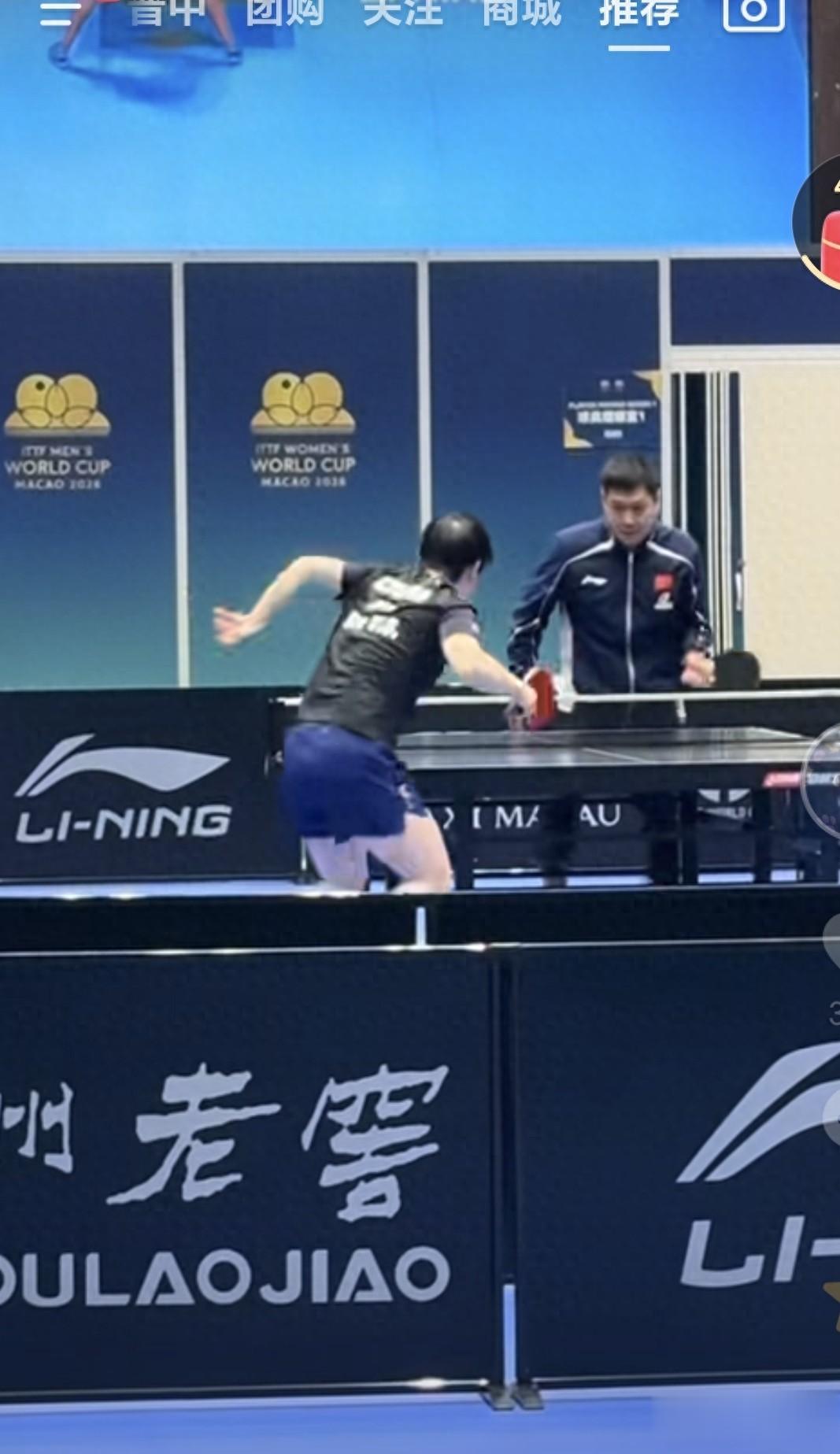 昨天莎莎没有比赛,她就一直在备战今天和梅谢芙的比赛,梅谢芙是左手,看到昨天是韩菲儿一直和莎莎在一块儿的。今天的赛前热身训练,看到邱贻可教练在陪莎莎练球,邱导还会左手打球呢,他用左手模仿梅谢芙的发球,这样看莎莎确实瘦了很多呢,邱导也瘦了。