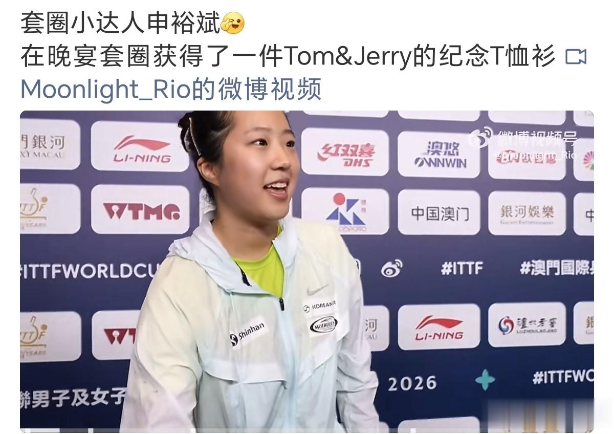 到了混采区,申裕斌也接受了采访,在澳门世界杯欢迎晚宴上,申裕斌也玩了套圈,她说自己获得了一件Tom&Jerry的纪念T恤衫,她在讲的时候还加上了手语,太可爱了。昨天申裕斌是赢了削球手琳达,现在申裕斌打削球是越来越有心得的。