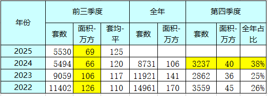 所以在四季度占比也可以发现,其他年份都是25%的均值,到了2024年,占比高达38%,一个季度卖了40万方,3000多套。