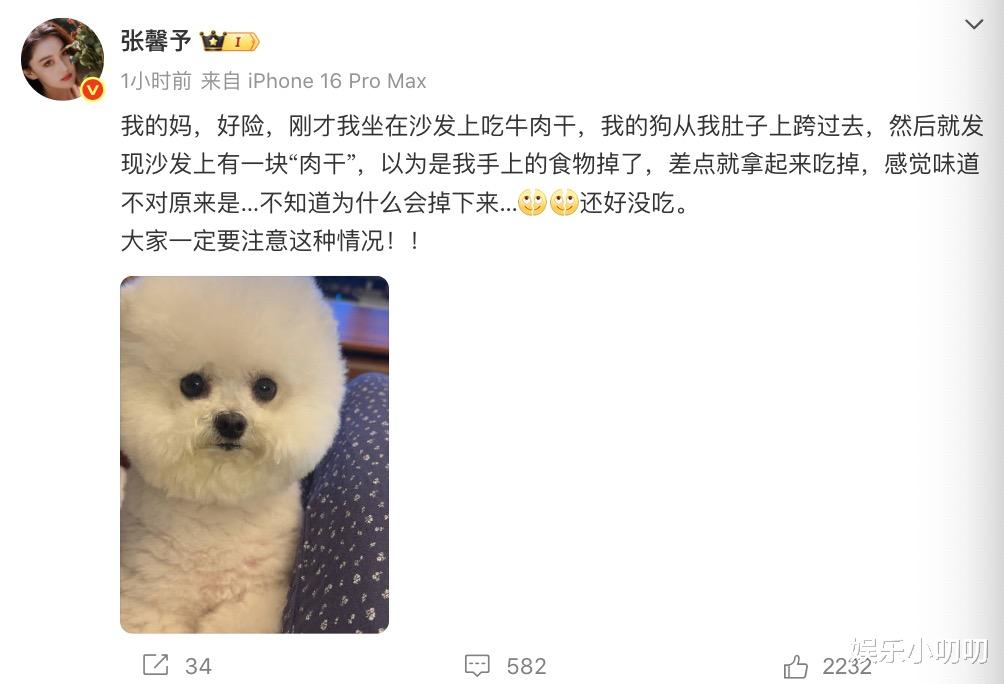 其实蛮喜欢张馨予这种娱圈社交平台真活人,毕竟这种能把自己私事、糗事分享出来的艺人真不多,似乎娱圈现在的社交平台都是为了宣传,为了流量,能这么不把网友当外人的真的是少见。之前分享自己房子被水淹的现场,现在又分享自己误把狗粑粑当牛肉干的糗事,还不忘提醒大家注意,张馨予这性格真的是爱了!
