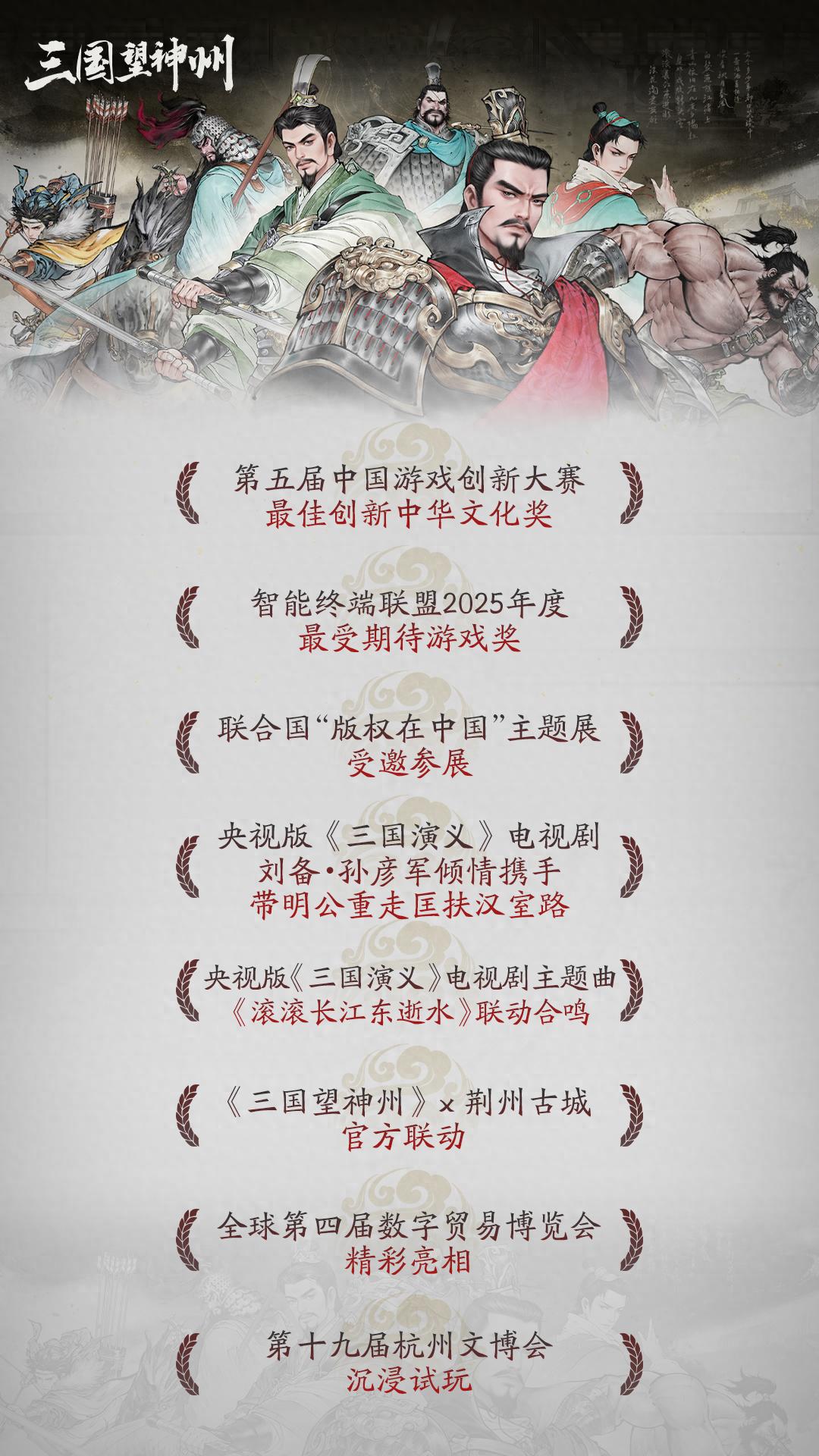 斩获“第五届中国游戏创新大赛最佳创新中华文化奖”、“智能终端联盟2025年度最受期待游戏奖”,受邀参展联合国“版权在中国”主题展,与荆州古城达成官方合作,亮相“全球第四届数字贸易博览会”与“第十九届杭州文博会”。
