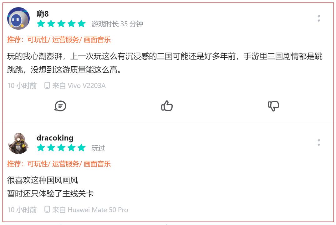 TapTap平台上,这款新游开服后评分稳居8分以上,玩家好评如潮,不少用户留言“终于等到不肝不氪的优质战棋”、“国风美术直接封神”,足见《三国望神州》受欢迎程度。