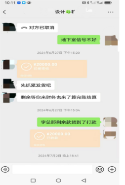 “当时对方设计师特意给了色卡,说按这个标准做,我还保留着微信聊天记录。”聂先生表示,合同签订后,A家具商城严格按约定生产供货,B公司分5次支付货款合计31.2万元,A家具商城则分5批次送货。期间应B公司要求,还追加了会议室桌子、椅子,减少了部分家具,最终核算总货款36.4242万元,对方尚欠5.2242万元尾款未付。