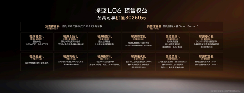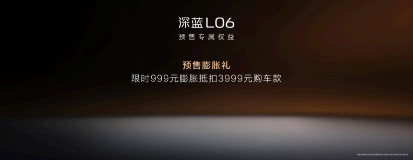 10月30日,深蓝L06正式预售了,预售价13.99万-16.19万,权益方面,包括999元膨胀抵扣3999元购车款、赠送大疆Pocket3、12月31日前下定Ultra+激光版免费赠送磁流变悬架终身质保等等权益。