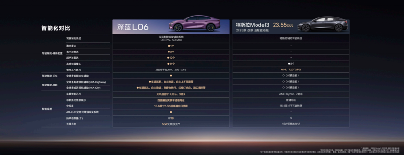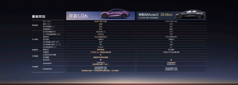 在基础数据上,其长宽高分别为4830×1905×1480mm,轴距2900mm;前备箱空间100L,后备箱空间464L。作为对比,特斯拉Model 3则是4720×1848×1442mm,轴距2875mm,所以深蓝L06是比Model 3还要略大的。