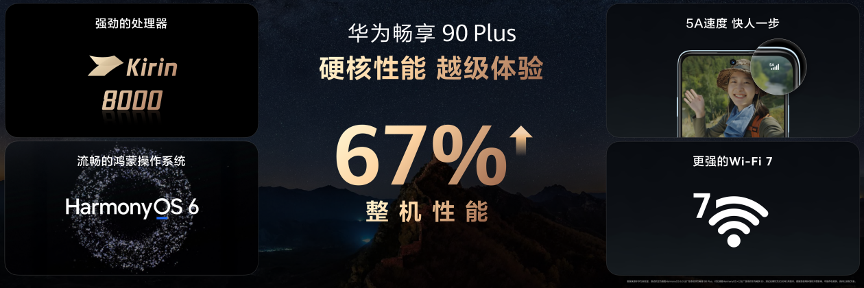 在性能体验上,华为畅享 90系列全系标配麒麟8系芯片。这颗芯片继承了麒麟家族强大的算力与能效基因,配合鸿蒙操作系统6的深度优化,带来了前所未有的流畅体验。无论是日常应用的快速启动,还是多任务切换时的丝滑动画,都展现了“久用不卡”的硬核实力。鸿蒙操作系统6更不仅仅是流畅的基石,其“AI亲情防诈”功能可以精准识别诈骗电话,支持子女远程一键挂断,为家庭用户构筑起坚实的安全防线。