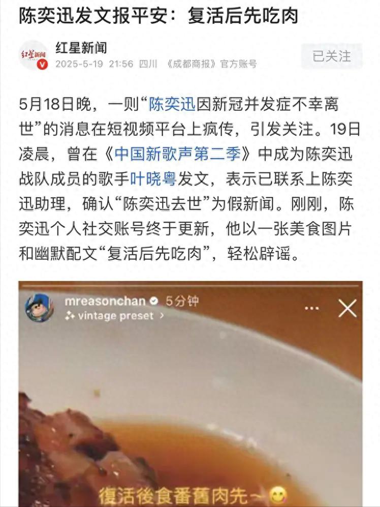 随后,陈奕迅本人在社交平台晒出美食照片,配文 “复活后食番旧肉先”,试图以幽默化解这场风波。然而,没有本人出镜的辟谣,还是引发诸多猜测。有网友指出,仅凭一张美食图,难以确凿证实他的安好,甚至有声音质疑该账号是否为陈奕迅本人在操作。