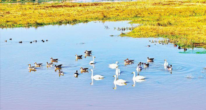 为给这些国宝们打造优美舒适的越冬环境,工作人员全员轮班、错时开展常态化巡护管护,开展岸线“清漂”行动和湿地志愿服务活动。2024年,湿地公园共栽植食源性植物1500余棵、水生植物18种100多万株,恢复湿地植被面积约11.52公顷。