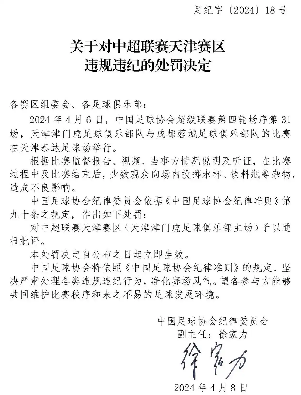 屡教不改!这不是天津津门虎球迷本赛季第一次丢水瓶。上一次在中超第四轮主场对阵成都蓉城的比赛中,也因为有球迷投掷水瓶饮料的杂物被足协通报批评(下图)。不知道是不是不痛不痒的通报批评不给力,有的球迷依旧明知故犯,一犯再犯。对此,有球迷质疑,这次足协是罚还是不罚呢?