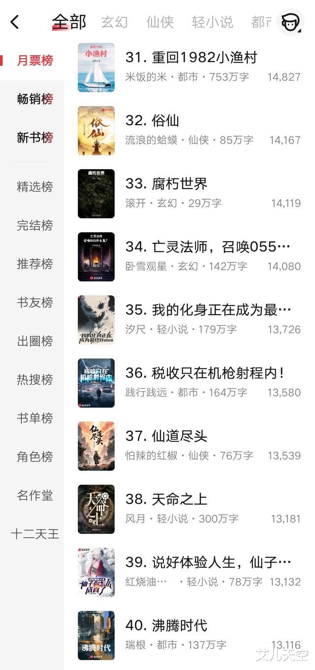 第31到40名,滚开的《腐朽世界》马上三十万字了,小说还没上架,周末三江换榜已经在榜上了,估计下周就能上架了,应该不至于推迟到下个月。小说假追从四万五又回到四万三上下了。