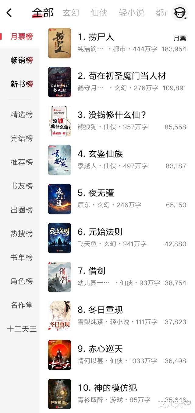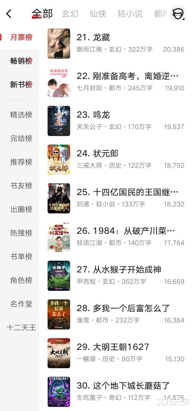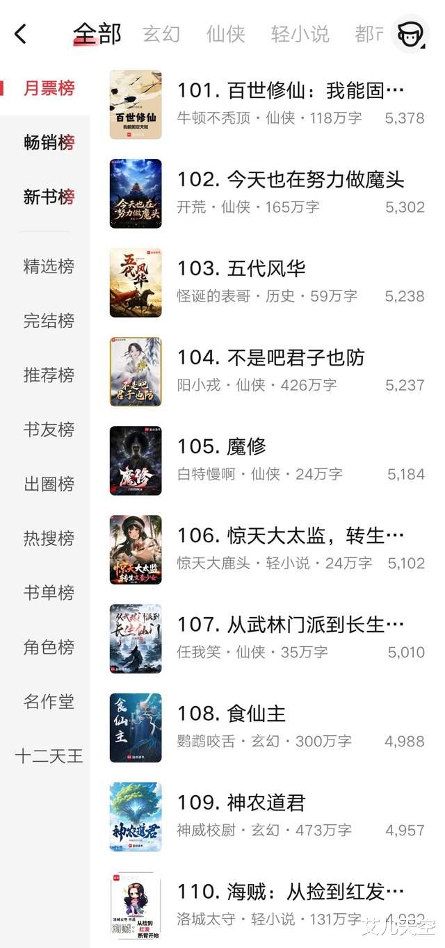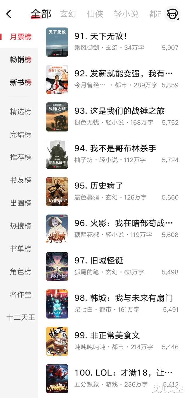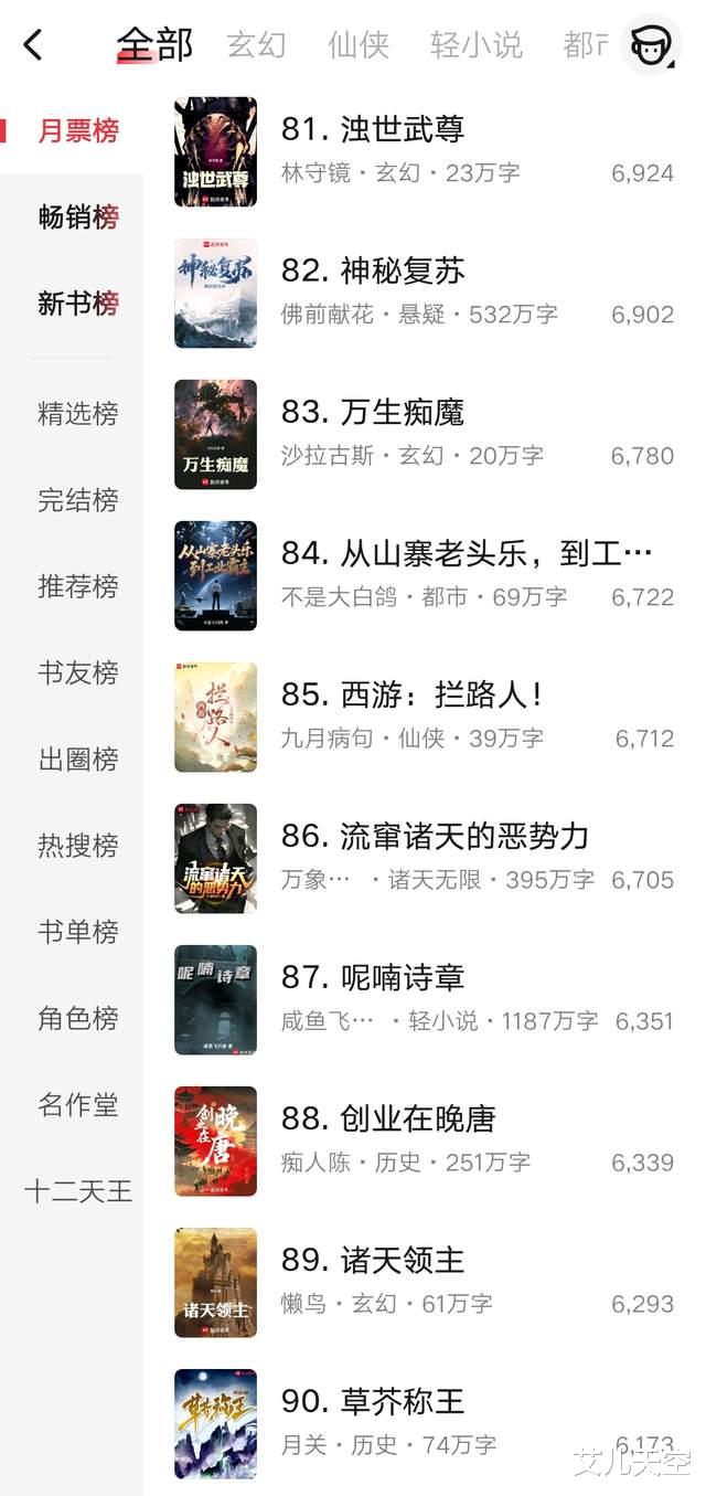 浊世武尊、山寨老头乐都从九十开外升了上来,月关的新书《草芥称王》更新也不慢,日更九千左右,大精品成绩。