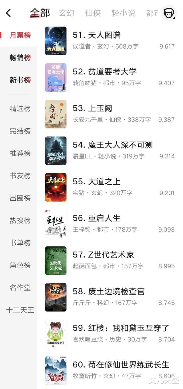 斤斤斤的《废土边境检查官》从六十开外升了上来,长安九千里的《上玉阙》从七十开外升了上来,而喜欢喝豆浆的红楼同人则是从八十开外进入到前六十了,主角和林黛玉互换身体,看作者说后面主角也要做皇帝的。