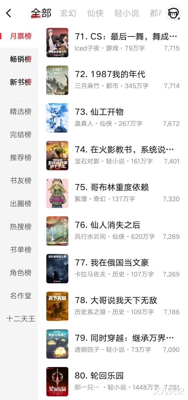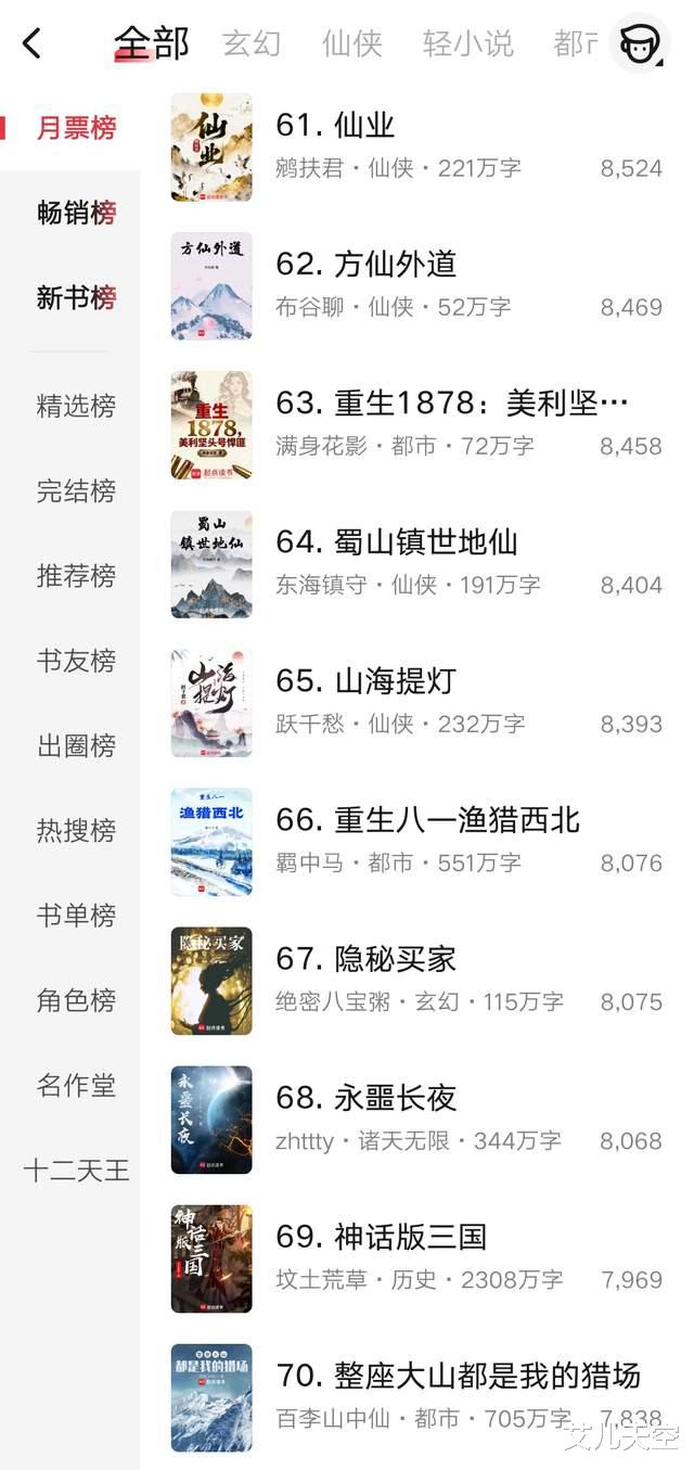 第61到70名,《仙业》主角成就至尊元神法相了,zhttty的《永噩长夜》已经写完上半部开启下半部征程了,看来篇幅要跟之前的《洪荒历》差不多。