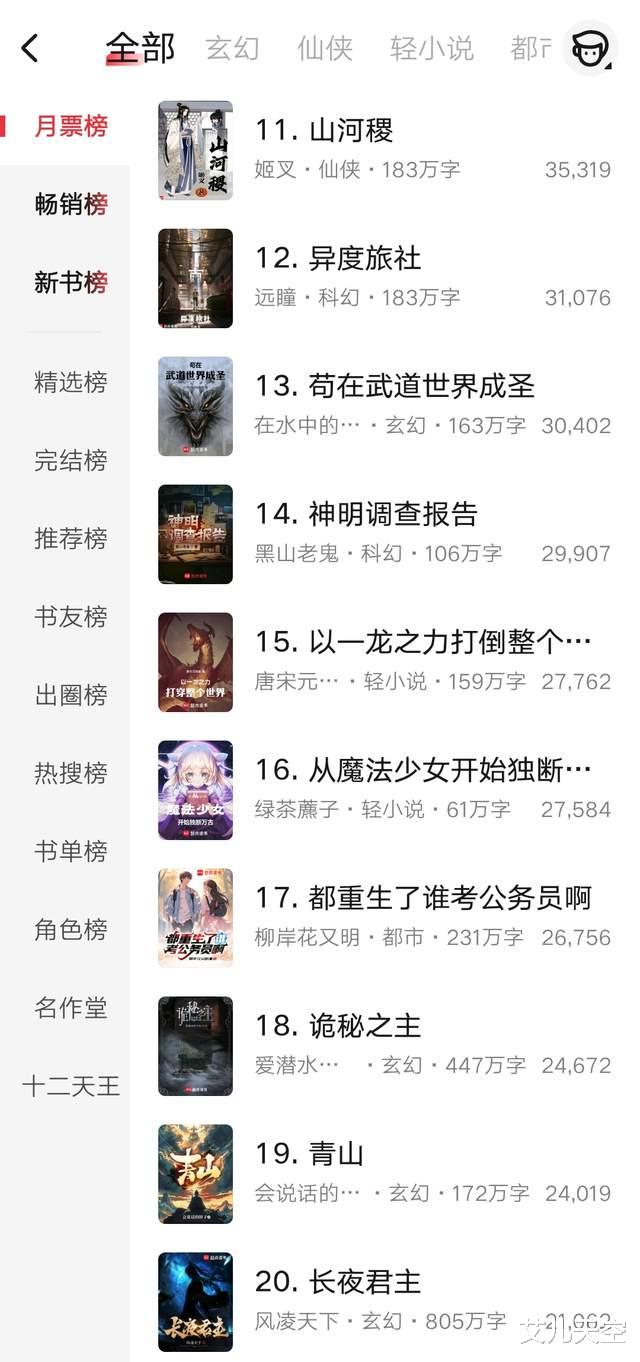诡秘、青山排名也没变,风凌天下的《长夜君主》爆更再进前二十了。