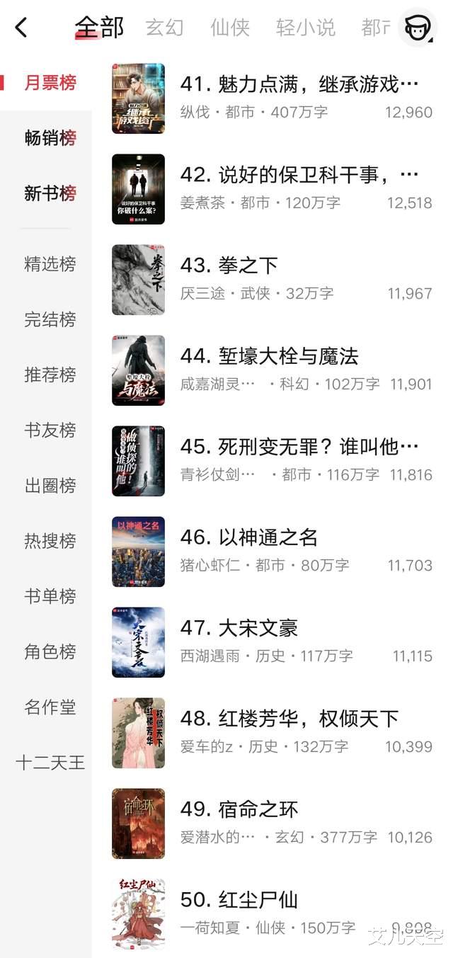 第41到50名,乌贼的《宿命之环》从五十开外又升了上来,宅猪的《大道之上》因为确定后续随缘更新了,排名自然下滑跌出前五十了。