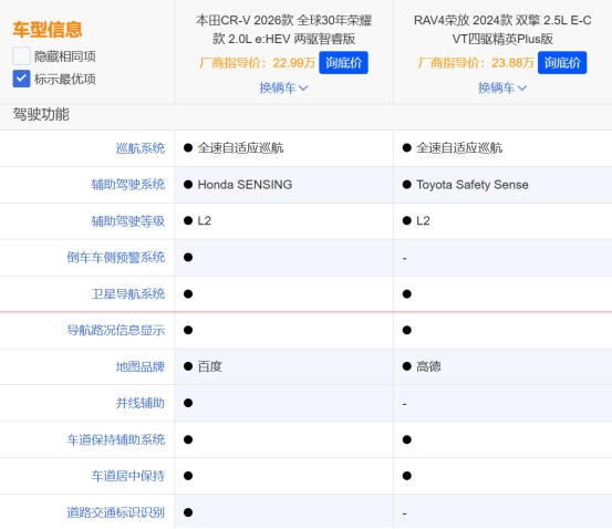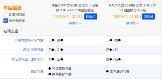 不仅如此,其安全辅助系统的升级同样让人眼前一亮,其最新搭载的Honda SENSING 360+安全超感系统通过8颗超声波雷达、5颗毫米波雷达和6个摄像头的协同工作,能实现涵盖超车辅助、入匝道辅助、弯道偏离预警等超过20项驾驶辅助功能,大大提升了驾驶安全性。与丰田RAV4荣放相比,东风本田CR-V多了开门预警、并线辅助、倒车车侧预警等功能,能为驾乘人员提供更加全面的安全保障。被动安全方面,CR-V全系标配10个安全气囊,反观荣放只有8个,无论是主动安全还是被动安全后者都落了下风。