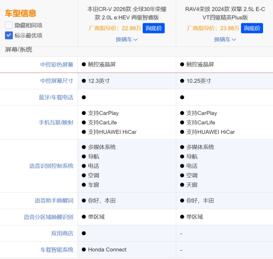 近年来的“双十一”,智能手机、智能家居等科技产品销量屡创新高,说明智能体验已成为当代用户决策的关键。而当这种期待被带入汽车消费,车辆的科技配置自然成为关注的焦点。对此,不久前刚刚完成焕新的东风本田CR-V全球30年荣耀款也在包括智能科技的多个层面,实现了对自我的超越。首先是互联体验的革新,全新搭载的Honda CONNECT 4.0智导互联系统以更直观的界面设计和更精准的智能语音控制,为用户带来了更加便捷的操作体验。与竞品相比,东风本田CR-V中控屏尺寸达到了12.3英寸,远超丰田RAV4荣放的10.25英寸中控屏,并且还具备面部识别、应用商店等后者不具备的功能。